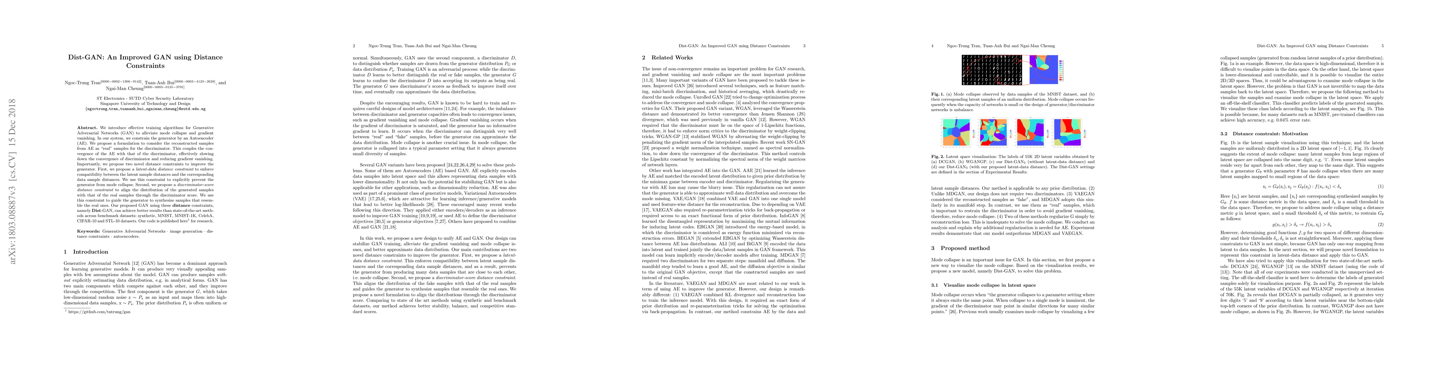 We introduce effective training algorithms for Generative Adversarial Networks (GAN) to alleviate mode collapse and gradient vanishing. In our system, we constrain the generator by an Autoencoder (AE). We propose a formulation to consider the reconstructed samples from AE as "real" samples for the discriminator. This couples the convergence of the AE with that of the discriminator, effectively slowing down the convergence of discriminator and reducing gradient vanishing. Importantly, we propose two novel distance constraints to improve the generator. First, we propose a latent-data distance constraint to enforce compatibility between the latent sample distances and the corresponding data sample distances. We use this constraint to explicitly prevent the generator from mode collapse. Second, we propose a discriminator-score distance constraint to align the distribution of the generated samples with that of the real samples through the discriminator score. We use this constraint to guide the generator to synthesize samples that resemble the real ones. Our proposed GAN using these distance constraints, namely Dist-GAN, can achieve better results than state-of-the-art methods across benchmark datasets: synthetic, MNIST, MNIST-1K, CelebA, CIFAR-10 and STL-10 datasets. Our code is published here (https://github.com/tntrung/gan) for research.
