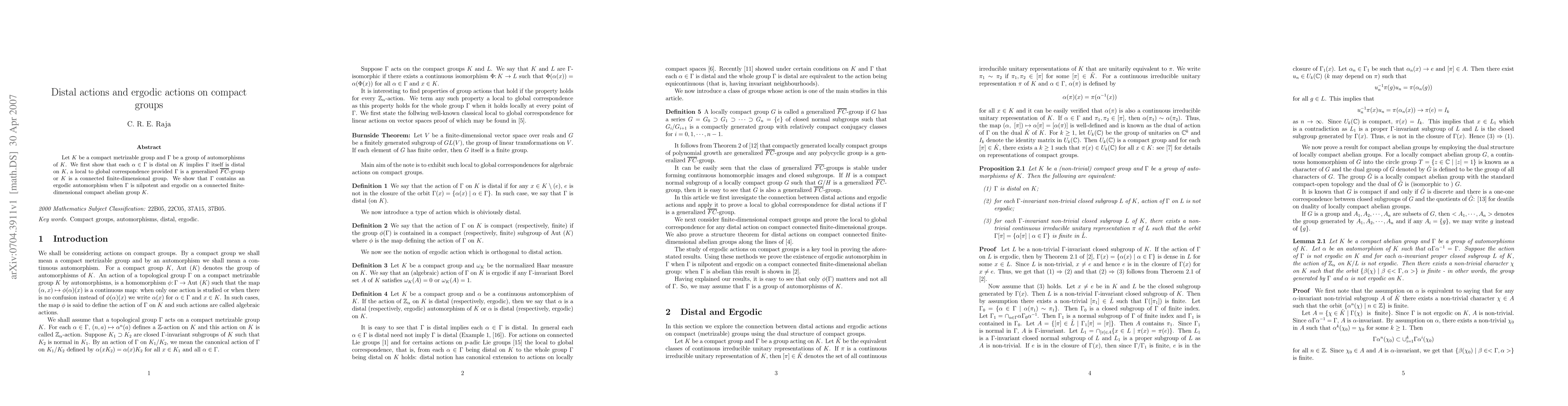 This paper demonstrates that if each automorphism in a group $\Ga$ of automorphisms on a compact metrizable group $K$ is distal, then $\Ga$ is distal under certain conditions. It also proves the existence of an ergodic automorphism in $\Ga$ when $\Ga$ is nilpotent and acts ergodically on a connected finite-dimensional compact abelian group $K$.
