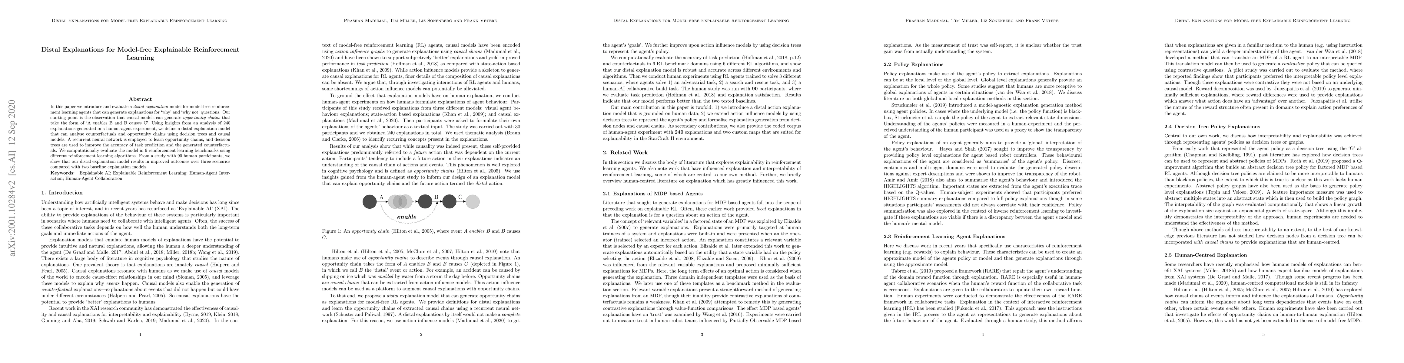 This paper proposes a distal explanation model for model-free reinforcement learning agents that can provide "why" and "why not" explanations. The model uses decision trees and causal models to analyze opportunity chains and counterfactuals, employing a recurrent neural network to learn these chains. The model's effectiveness is evaluated across six benchmarks and shown to improve outcomes in human evaluations compared to baseline models.