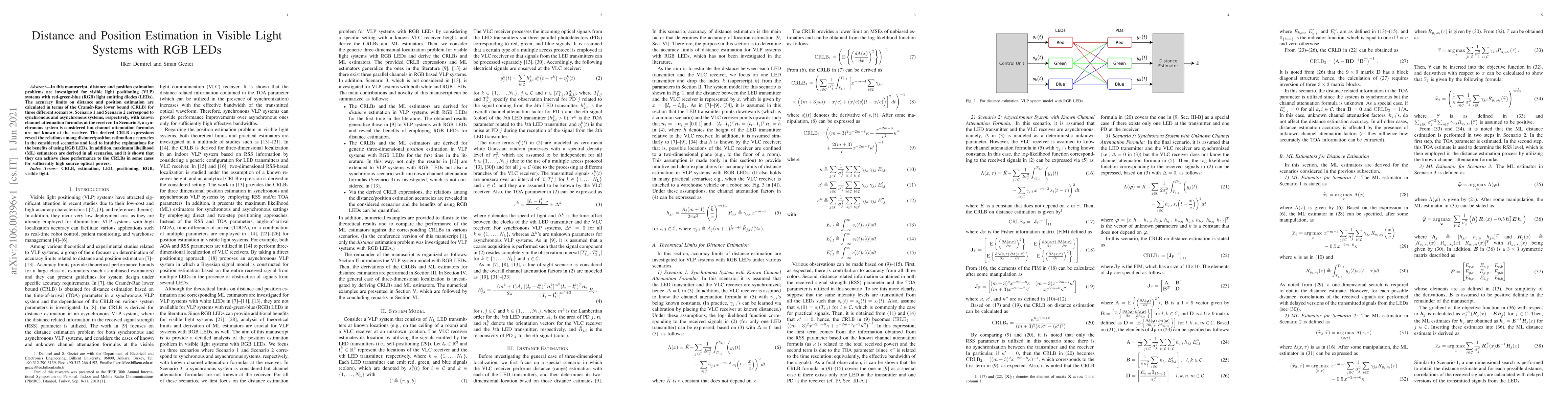 In this manuscript, distance and position estimation problems are investigated for visible light positioning (VLP) systems with red-green-blue (RGB) light emitting diodes (LEDs). The accuracy limits on distance and position estimation are calculated in terms of the Cramer-Rao lower bound (CRLB) for three different scenarios. Scenario~1 and Scenario~2 correspond to synchronous and asynchronous systems, respectively, with known channel attenuation formulas at the receiver. In Scenario~3, a synchronous system is considered but channel attenuation formulas are not known at the receiver. The derived CRLB expressions reveal the relations among distance/position estimation accuracies in the considered scenarios and lead to intuitive explanations for the benefits of using RGB LEDs. In addition, maximum likelihood (ML) estimators are derived in all scenarios, and it is shown that they can achieve close performance to the CRLBs in some cases for sufficiently high source optical powers.