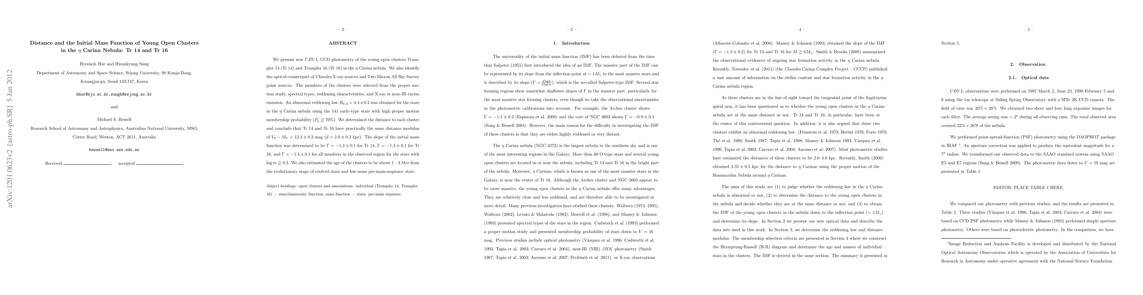 This paper presents new UBVI_C CCD photometry for the young open clusters Tr 14 and Tr 16 in the Eta Carina Nebula, determining their distance modulus and initial mass function. The clusters are found to have a nearly identical distance of 2.9±0.3 kpc and an initial mass function slope of Γ=-1.3±0.1 for both clusters.