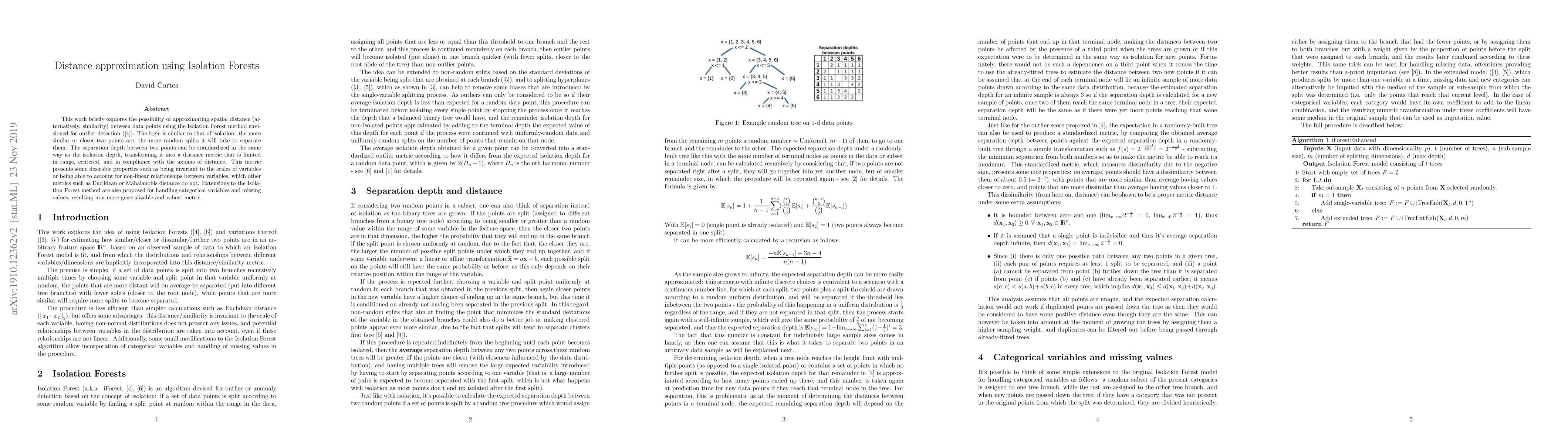 This paper proposes using the Isolation Forest method, originally for outlier detection, to approximate spatial distance between data points. The method transforms separation depth into a standardized distance metric that is invariant to variable scales and can handle non-linear relationships, with extensions to manage categorical variables and missing data.