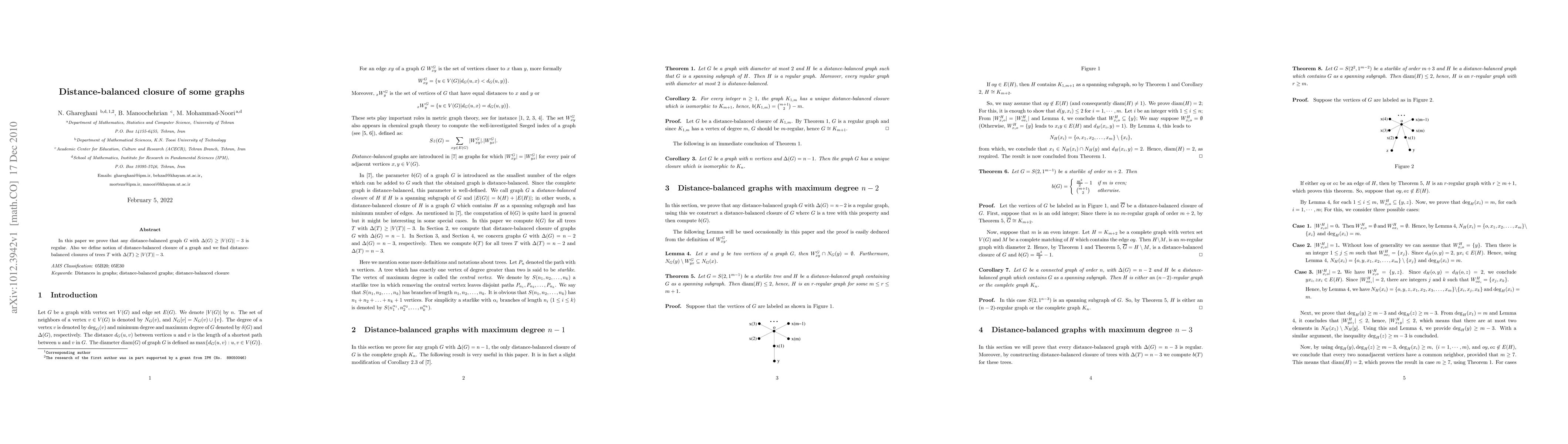 In this paper we prove that any distance-balanced graph $G$ with $\Delta(G)\geq |V(G)|-3$ is regular. Also we define notion of distance-balanced closure of a graph and we find distance-balanced closures of trees $T$ with $\Delta(T)\geq |V(T)|-3$.