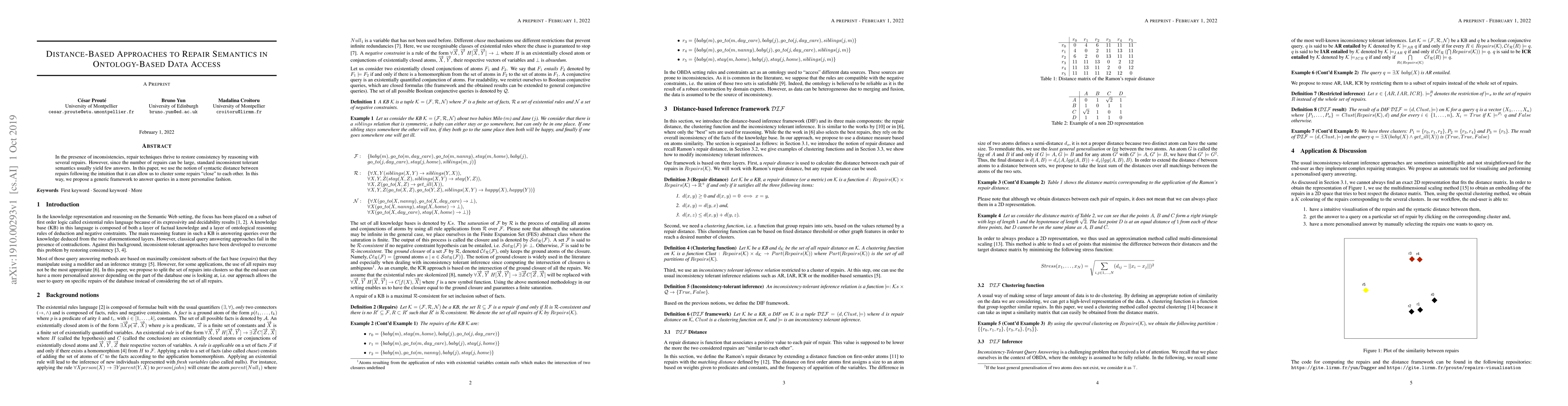 In the presence of inconsistencies, repair techniques thrive to restore consistency by reasoning with several repairs. However, since the number of repairs can be large, standard inconsistent tolerant semantics usually yield few answers. In this paper, we use the notion of syntactic distance between repairs following the intuition that it can allow us to cluster some repairs "close" to each other. In this way, we propose a generic framework to answer queries in a more personalise fashion.