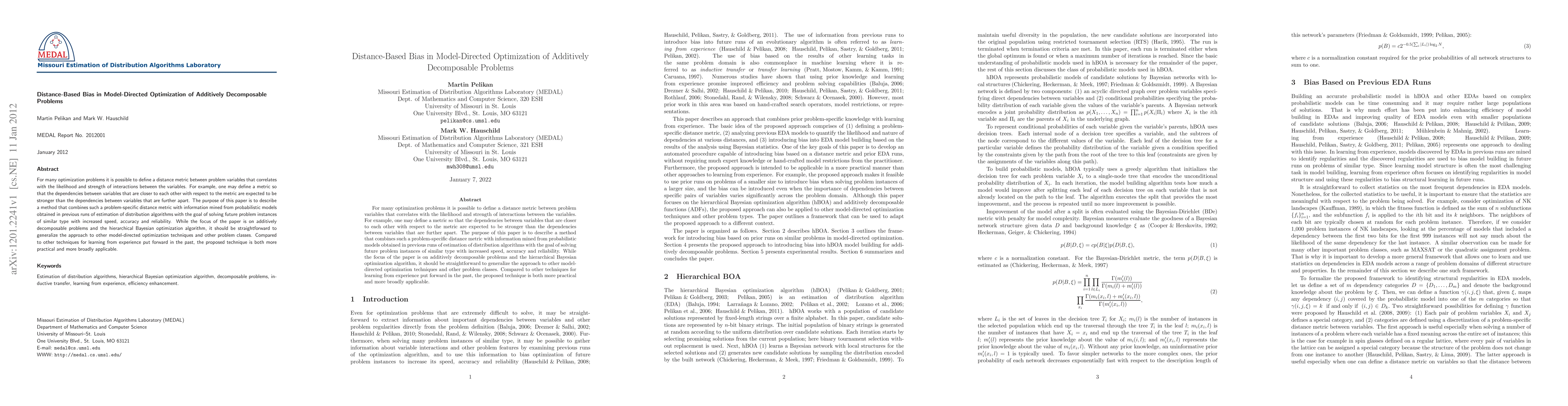 For many optimization problems it is possible to define a distance metric between problem variables that correlates with the likelihood and strength of interactions between the variables. For example, one may define a metric so that the dependencies between variables that are closer to each other with respect to the metric are expected to be stronger than the dependencies between variables that are further apart. The purpose of this paper is to describe a method that combines such a problem-specific distance metric with information mined from probabilistic models obtained in previous runs of estimation of distribution algorithms with the goal of solving future problem instances of similar type with increased speed, accuracy and reliability. While the focus of the paper is on additively decomposable problems and the hierarchical Bayesian optimization algorithm, it should be straightforward to generalize the approach to other model-directed optimization techniques and other problem classes. Compared to other techniques for learning from experience put forward in the past, the proposed technique is both more practical and more broadly applicable.