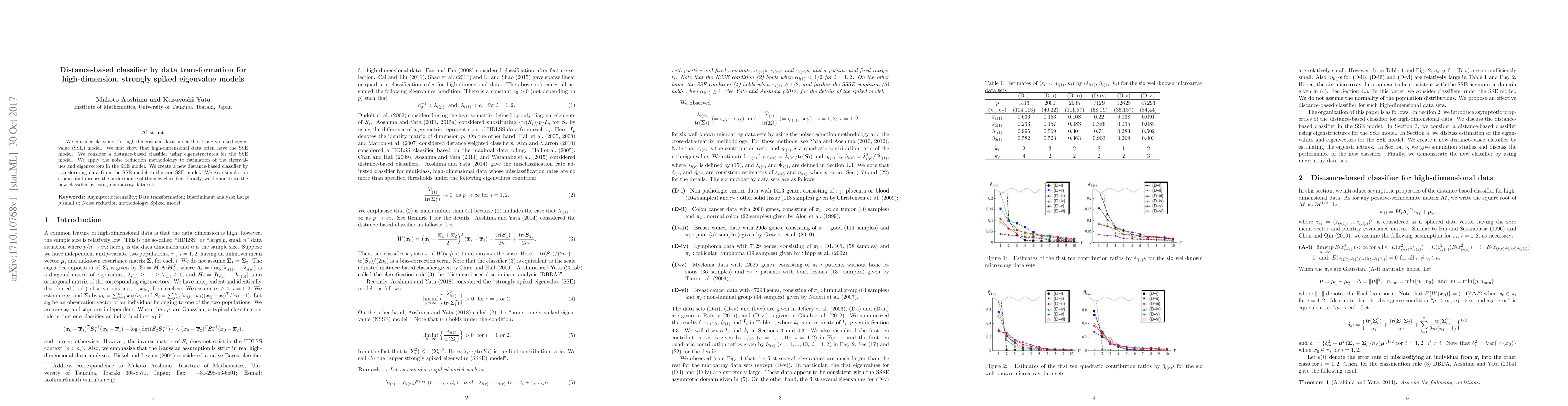 We consider classifiers for high-dimensional data under the strongly spiked eigenvalue (SSE) model. We first show that high-dimensional data often have the SSE model. We consider a distance-based classifier using eigenstructures for the SSE model. We apply the noise reduction methodology to estimation of the eigenvalues and eigenvectors in the SSE model. We create a new distance-based classifier by transforming data from the SSE model to the non-SSE model. We give simulation studies and discuss the performance of the new classifier. Finally, we demonstrate the new classifier by using microarray data sets.