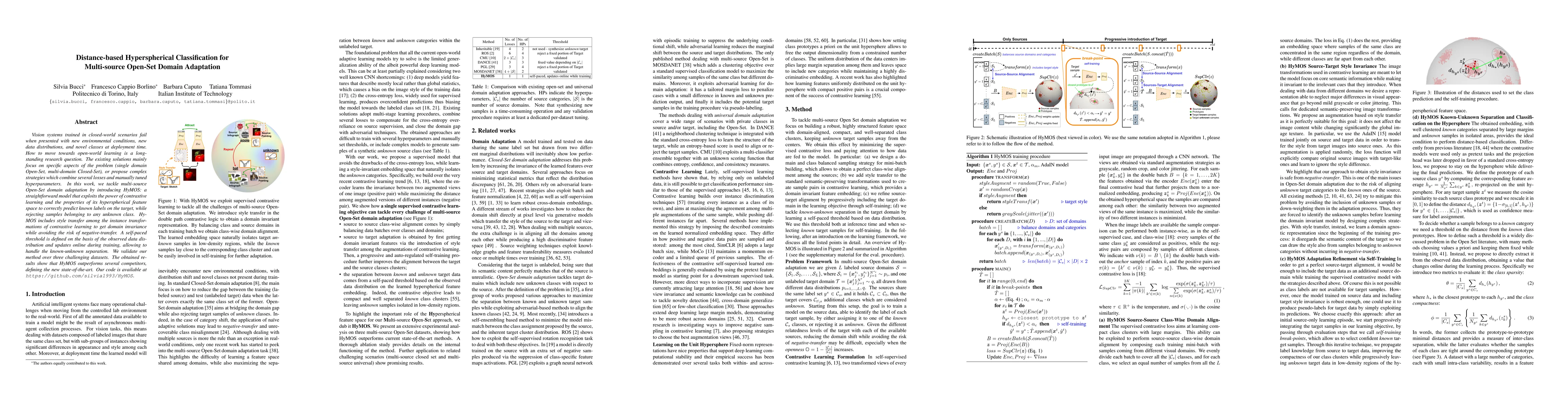 This paper introduces HyMOS, a simple yet effective model for multi-source Open-Set domain adaptation that leverages contrastive learning and hyperspherical feature spaces to handle unknown classes. HyMOS achieves domain invariance through style transfer and employs a self-paced threshold for known-unknown separation, outperforming existing methods on three datasets.