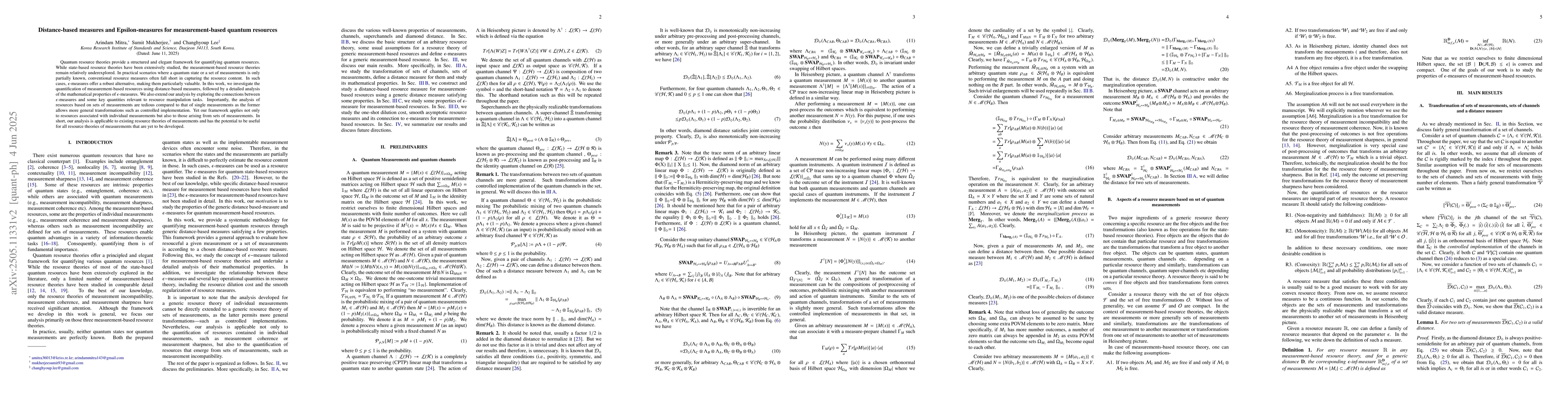 The paper investigates measurement-based quantum resources using distance-based measures and analyzes epsilon-measures, exploring their properties and connections to resource manipulation tasks.