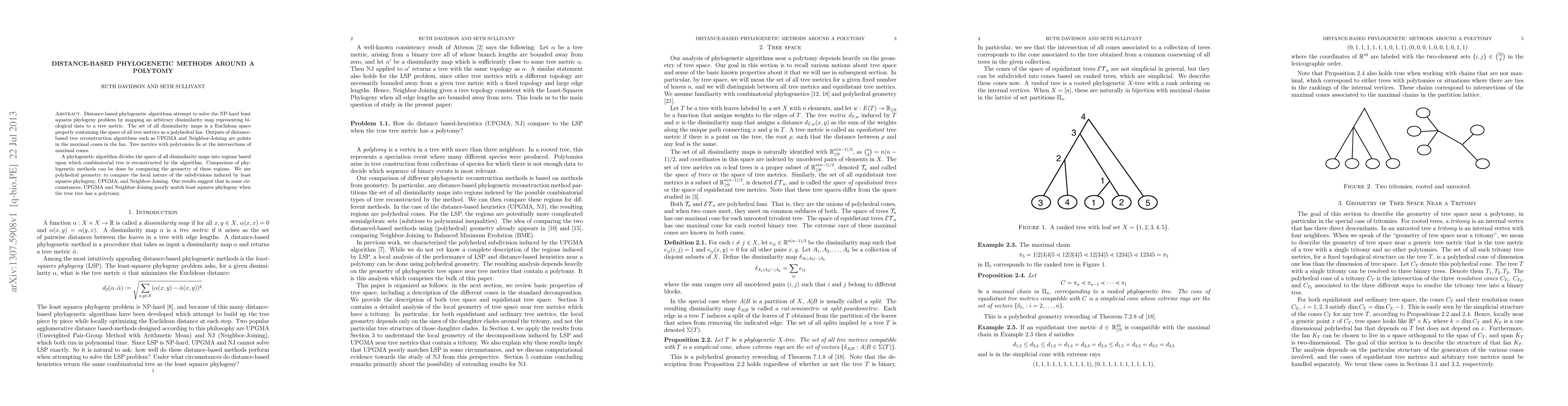 Distance-based phylogenetic algorithms attempt to solve the NP-hard least squares phylogeny problem by mapping an arbitrary dissimilarity map representing biological data to a tree metric. The set of all dissimilarity maps is a Euclidean space properly containing the space of all tree metrics as a polyhedral fan. Outputs of distance-based tree reconstruction algorithms such as UPGMA and Neighbor-Joining are points in the maximal cones in the fan. Tree metrics with polytomies lie at the intersections of maximal cones. A phylogenetic algorithm divides the space of all dissimilarity maps into regions based upon which combinatorial tree is reconstructed by the algorithm. Comparison of phylogenetic methods can be done by comparing the geometry of these regions. We use polyhedral geometry to compare the local nature of the subdivisions induced by least squares phylogeny, UPGMA, and Neighbor-Joining. Our results suggest that in some circumstances, UPGMA and Neighbor-Joining poorly match least squares phylogeny when the true tree has a polytomy.