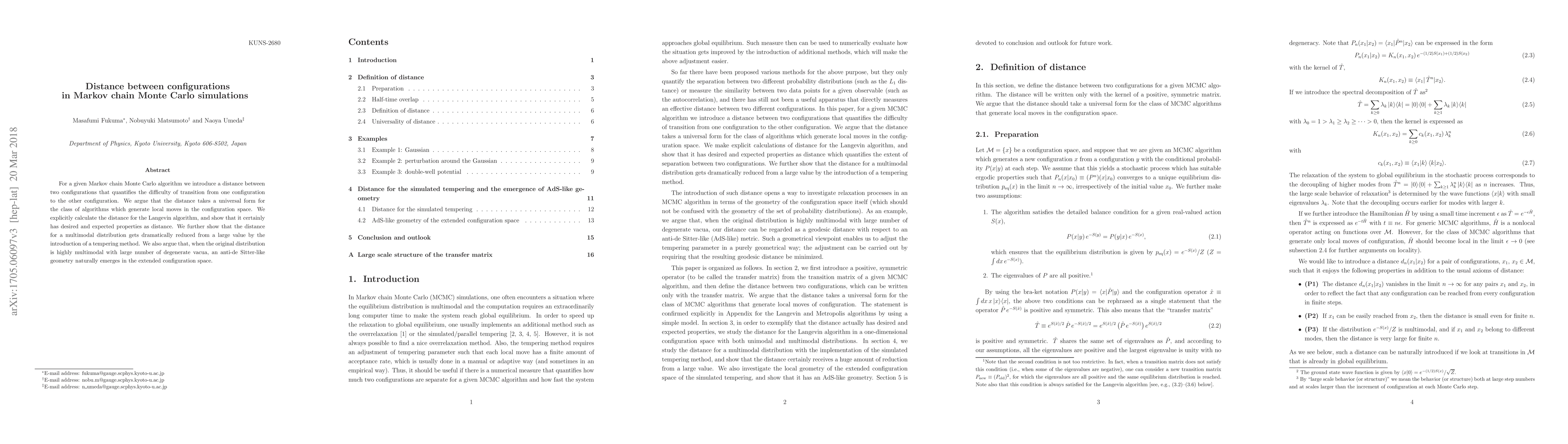 This paper introduces a universal distance metric for quantifying the transition difficulty between configurations in Markov chain Monte Carlo (MCMC) simulations, particularly for algorithms generating local moves. It demonstrates the metric's properties through the Langevin algorithm and shows that tempering methods significantly reduce the distance in multimodal distributions, leading to an anti-de Sitter-like geometry in highly multimodal spaces.