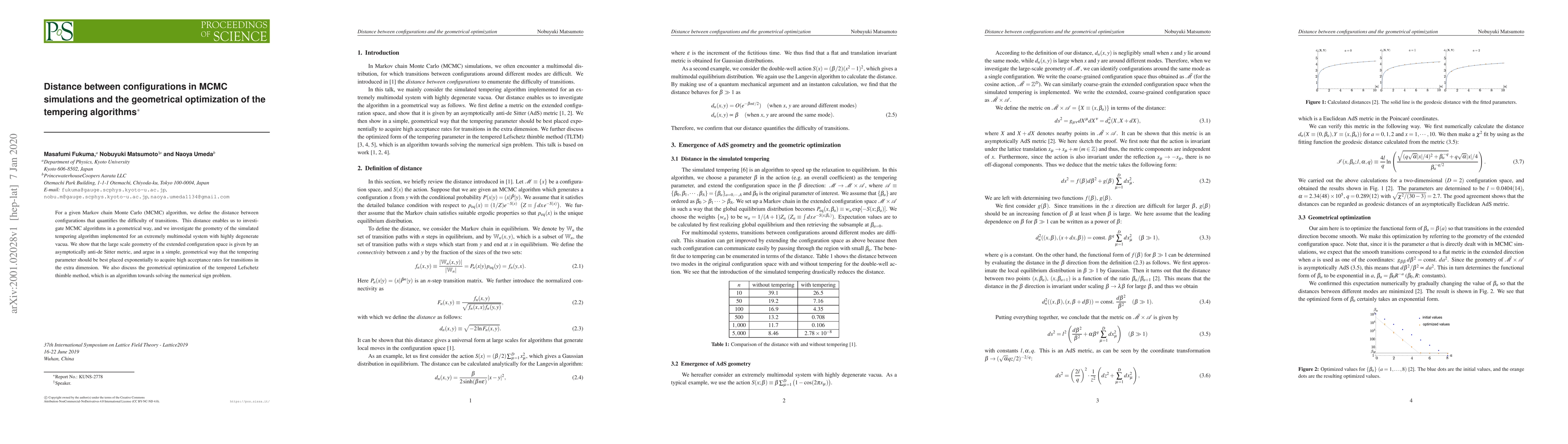 This paper defines a geometrical distance metric to quantify the difficulty of transitions in MCMC simulations, applying it to simulated tempering algorithms for multimodal systems. It reveals that the extended configuration space follows an anti-de Sitter metric and suggests an optimal exponential placement of the tempering parameter for high acceptance rates, also discussing the geometrical optimization of the tempered Lefschetz thimble method.