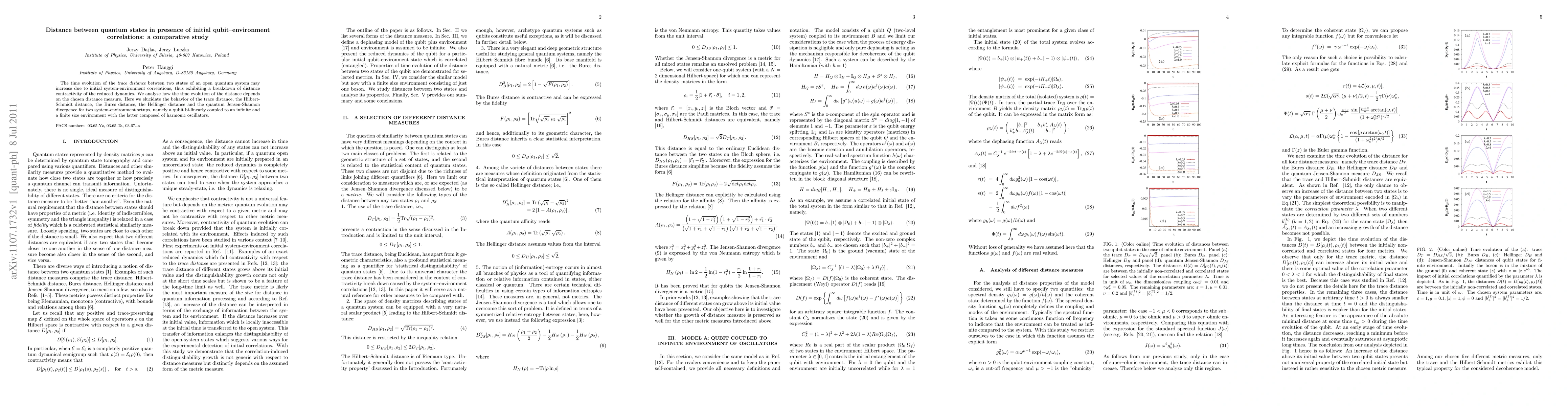 This paper investigates how initial correlations between a qubit and its environment affect the time evolution of various quantum state distances, revealing that the trace distance may increase, breaking the usual contractivity property. The study compares the trace distance, Hilbert-Schmidt distance, Bures distance, Hellinger distance, and quantum Jensen-Shannon divergence in two setups: a qubit coupled to an infinite environment and a finite-sized environment of harmonic oscillators.