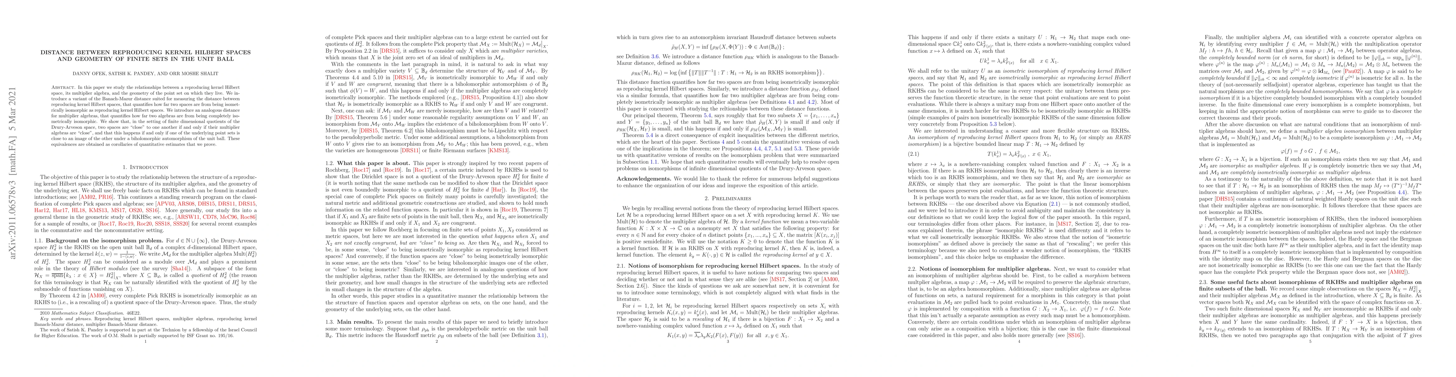 In this paper we study the relationships between a reproducing kernel Hilbert space, its multiplier algebra, and the geometry of the point set on which they live. We introduce a variant of the Banach-Mazur distance suited for measuring the distance between reproducing kernel Hilbert spaces, that quantifies how far two spaces are from being isometrically isomorphic as reproducing kernel Hilbert spaces. We introduce an analogous distance for multiplier algebras, that quantifies how far two algebras are from being completely isometrically isomorphic. We show that, in the setting of finite dimensional quotients of the Drury-Arveson space, two spaces are "close" to one another if and only if their multiplier algebras are "close", and that this happens if and only if the underlying point-sets are "almost congruent", meaning that one of the sets is very close to an image of the other under a biholomorphic automorphism of the unit ball. These equivalences are obtained as corollaries of quantitative estimates that we prove.