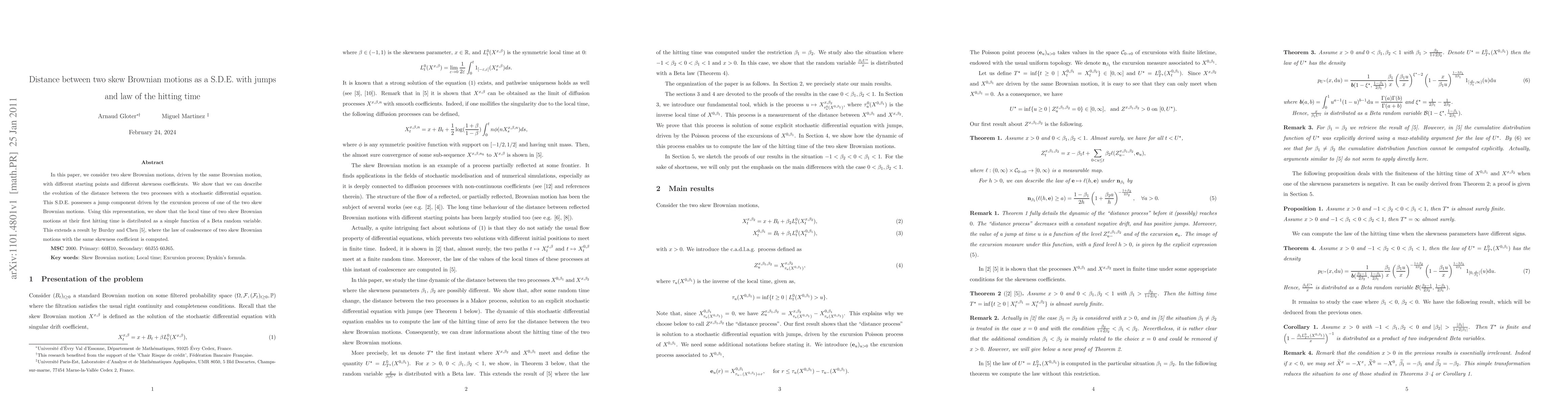 This paper investigates the distance between two skew Brownian motions with different starting points and skewness coefficients, describing it via a stochastic differential equation with a jump component. It also derives the distribution of the local time at the first hitting time as a function of a Beta random variable, extending previous results for identical skewness.