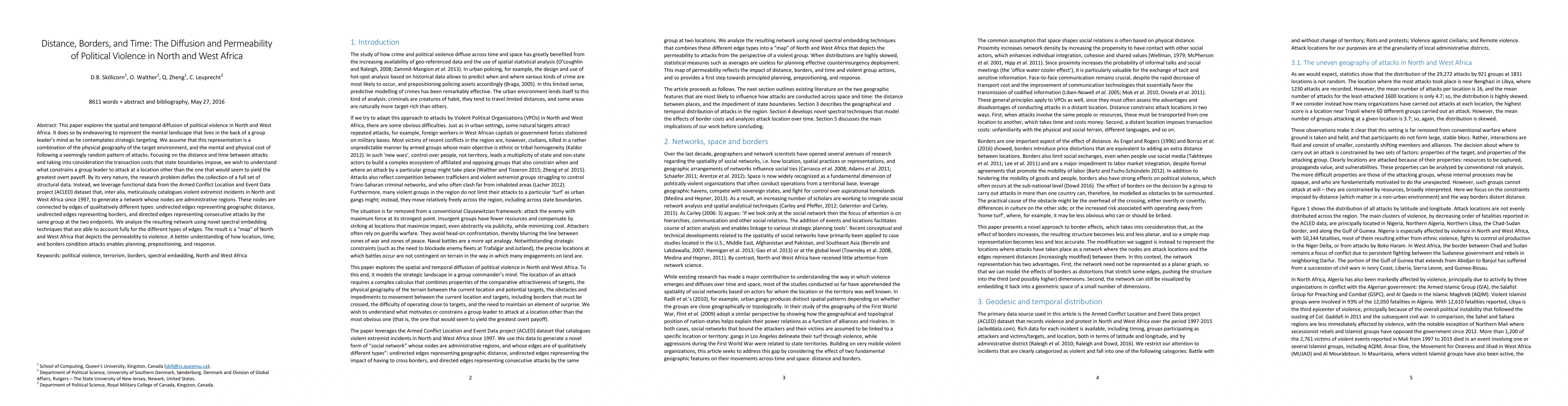 This paper investigates the spatial and temporal diffusion of political violence in North and West Africa, using the Armed Conflict Location and Event Data project (ACLED) dataset to construct a network of administrative regions. It employs spectral embedding techniques to analyze how distance, borders, and time influence attack patterns, revealing the permeability to violence across regions.