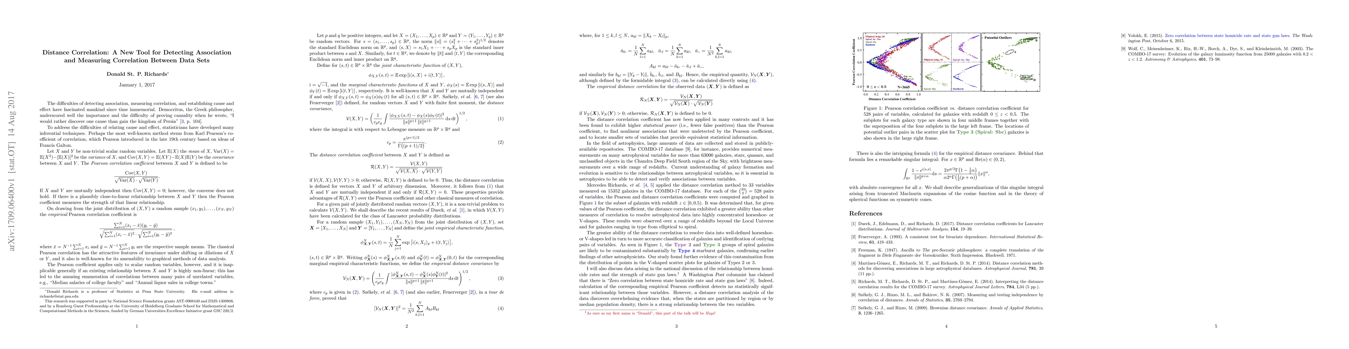 The difficulties of detecting association, measuring correlation, and establishing cause and effect have fascinated mankind since time immemorial. Democritus, the Greek philosopher, underscored well the importance and the difficulty of proving causality when he wrote, "I would rather discover one cause than gain the kingdom of Persia." To address the difficulties of relating cause and effect, statisticians have developed many inferential techniques. Perhaps the most well-known method stems from Karl Pearson's coefficient of correlation, which Pearson introduced in the late 19th century based on ideas of Francis Galton. I will describe in this lecture the recently-devised distance correlation coefficient and describe its advantages over the Pearson and other classical measures of correlation. We will examine an application of the distance correlation coefficient to data drawn from large astrophysical databases, where it is desired to classify galaxies according to various types. Further, the lecture will analyze data arising in the ongoing national discussion of the relationship between state-by-state homicide rates and the stringency of state laws governing firearm ownership. The lecture will also describe a remarkable singular integral which lies at the core of the theory of the distance correlation coefficient. We will see that this singular integral admits generalizations to the truncated Maclaurin expansions of the cosine function and to the theory of spherical functions on symmetric cones.