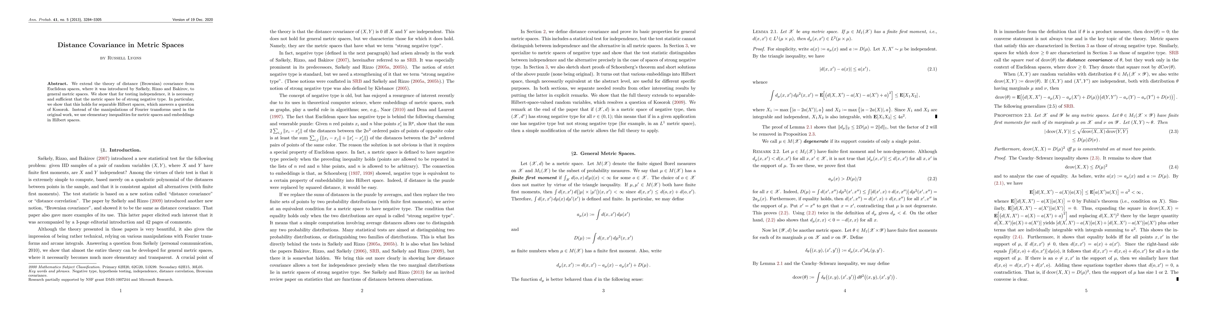This paper extends the concept of distance covariance from Euclidean to general metric spaces, proving that strong negative type is necessary and sufficient for independence testing. It utilizes elementary inequalities and embeddings in Hilbert spaces instead of Fourier transforms.