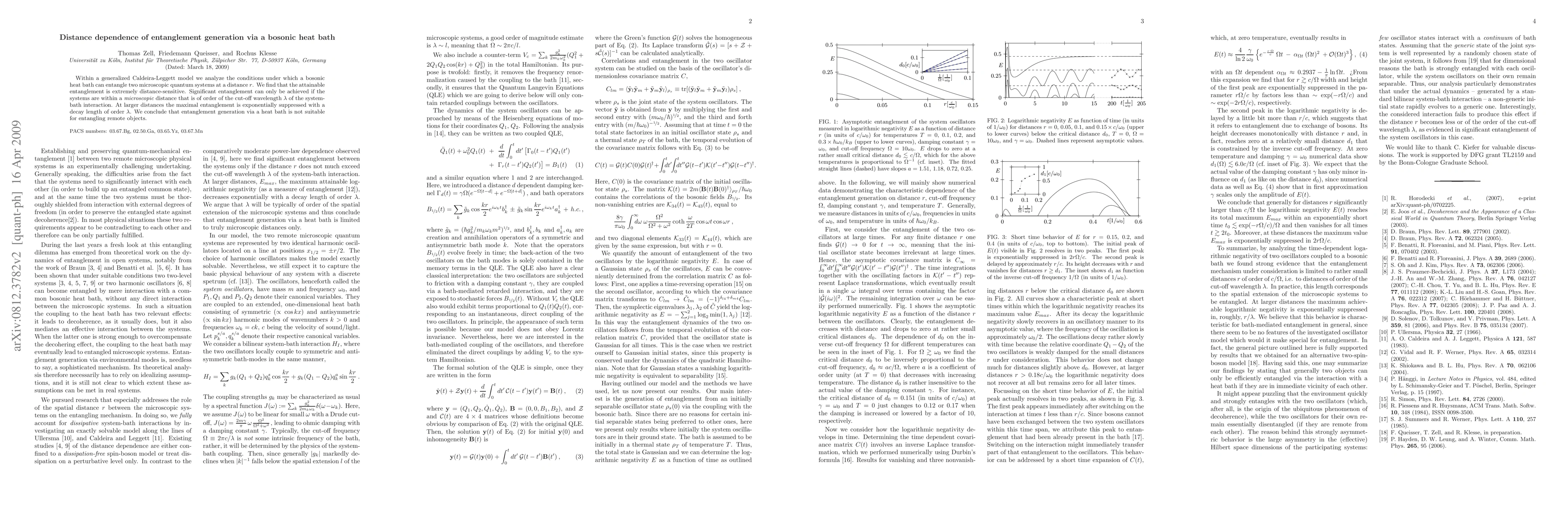This paper investigates how a bosonic heat bath can entangle two quantum systems at varying distances, finding that significant entanglement is only possible within a microscopic distance comparable to the system-bath interaction's cut-off wavelength. At larger distances, entanglement is exponentially suppressed, indicating that heat bath-mediated entanglement is ineffective for remote objects.