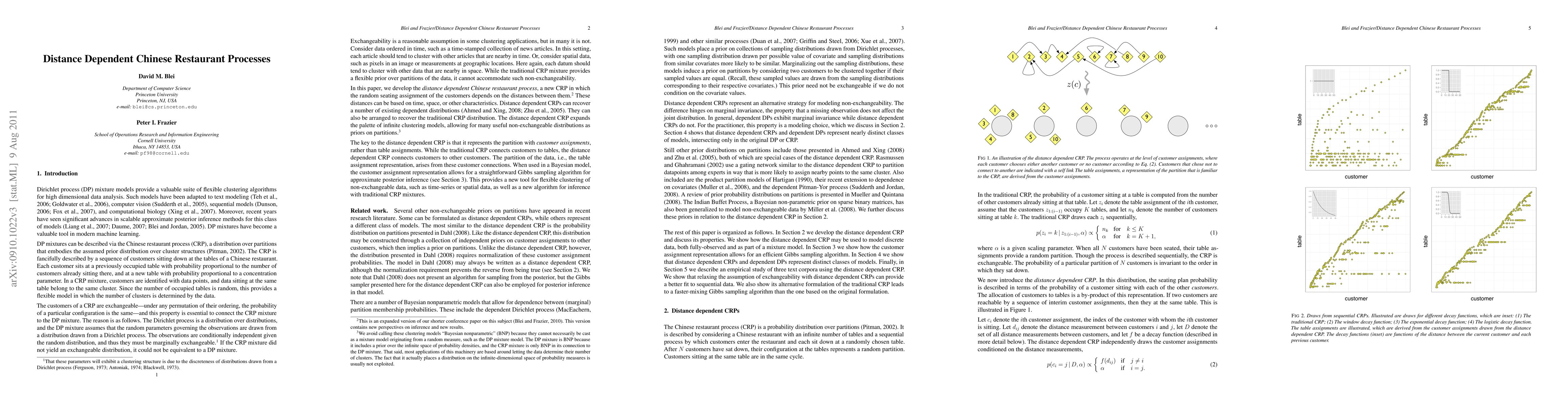 This paper introduces a flexible clustering model called the distance dependent Chinese restaurant process (CRP) that can handle non-exchangeability and is used to analyze dependencies across time or space. The model's performance is shown to be better than traditional CRPs for sequential data.