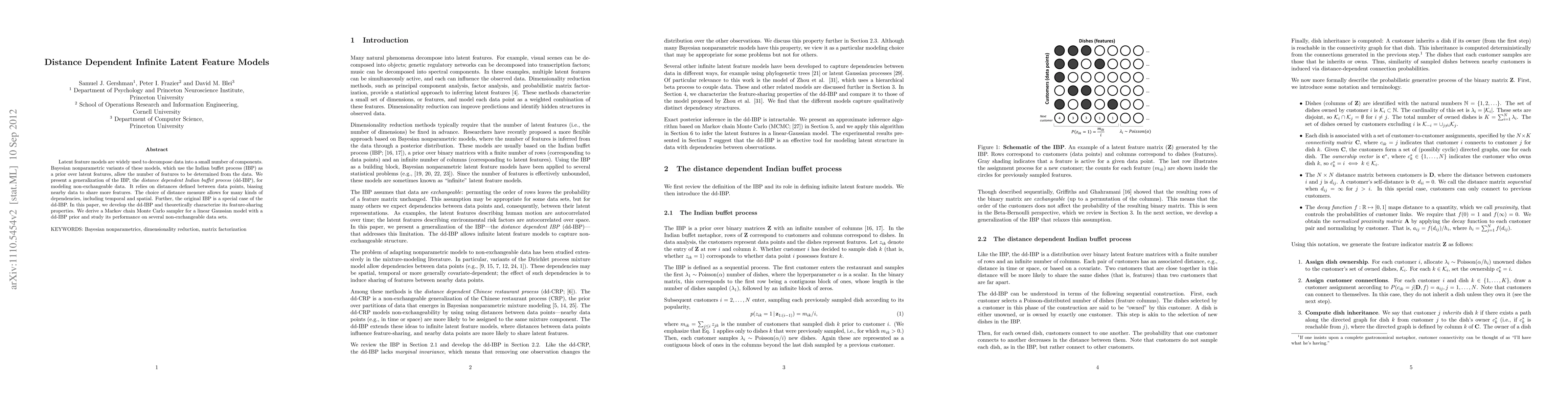 This paper introduces the distance dependent Indian buffet process (dd-IBP), a generalization of the Indian buffet process for modeling non-exchangeable data by incorporating distances between data points to bias nearby data to share more features. The authors develop a Markov chain Monte Carlo sampler for this model and evaluate its performance on various datasets.