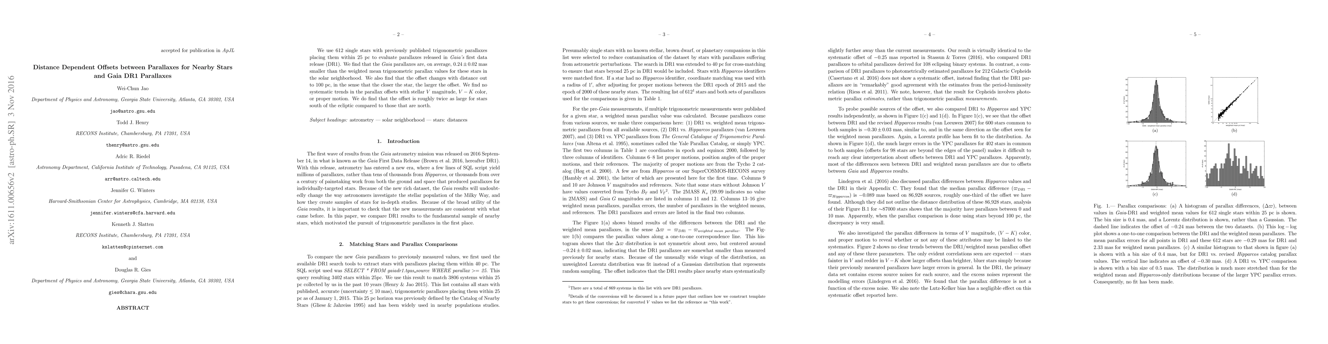 Summary: The study compares Gaia DR1 parallaxes to previously published trigonometric parallaxes for nearby stars, finding an average offset of $0.24 \pm 0.02$ mas, with the offset increasing for closer stars and being larger for southern stars. No systematic trends are found with respect to stellar magnitude, color, or proper motion.
