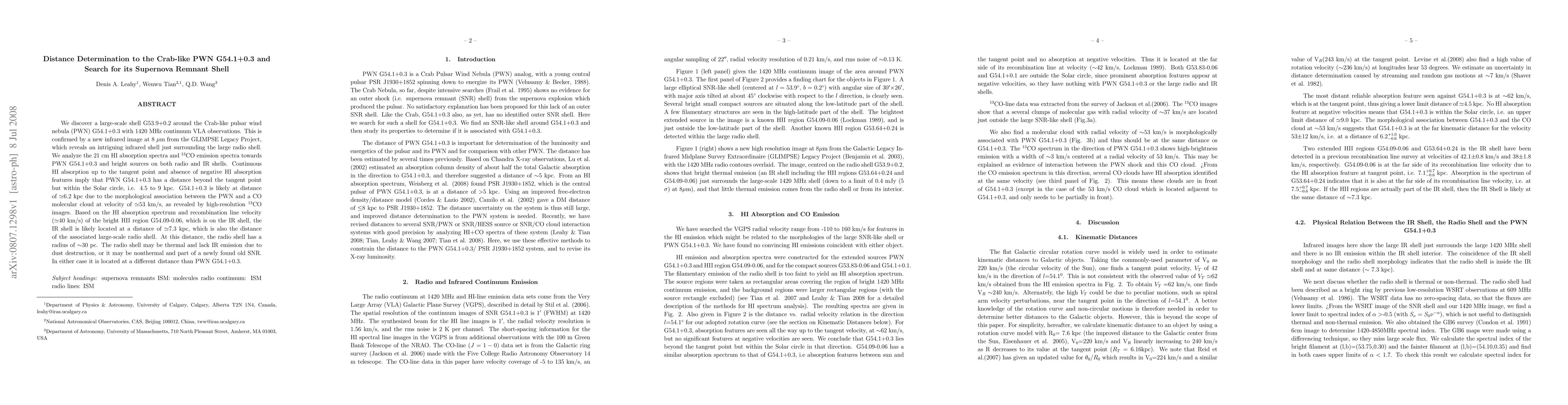 This paper determines the distance to the Crab-like pulsar wind nebula (PWN) G54.1+0.3 to be approximately 6.2 kpc, based on HI absorption and CO molecular cloud associations. It also identifies a large-scale radio shell and an infrared shell likely at a distance of 7.3 kpc, suggesting a possible association with an old supernova remnant.
