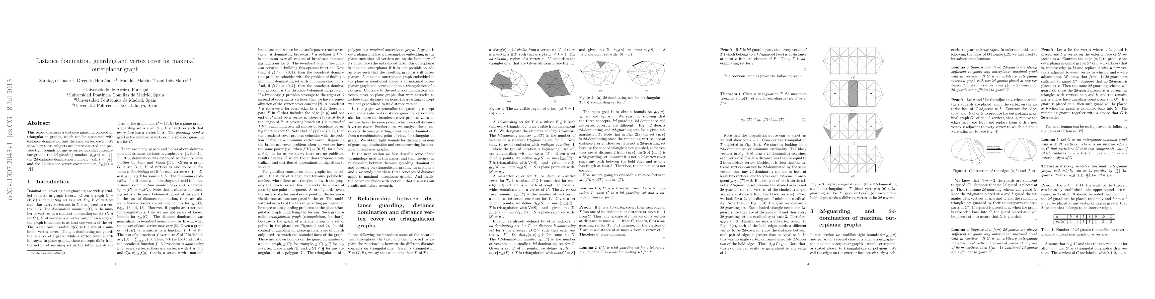 This paper explores distance guarding, distance domination, and distance vertex cover in maximal outerplanar graphs, establishing tight bounds: g_{2d}(n) = n/5, γ_{2d}(n) = n/5, and β_{2d}(n) = n/4 for any n-vertex graph. The relationships between these concepts are thoroughly analyzed.