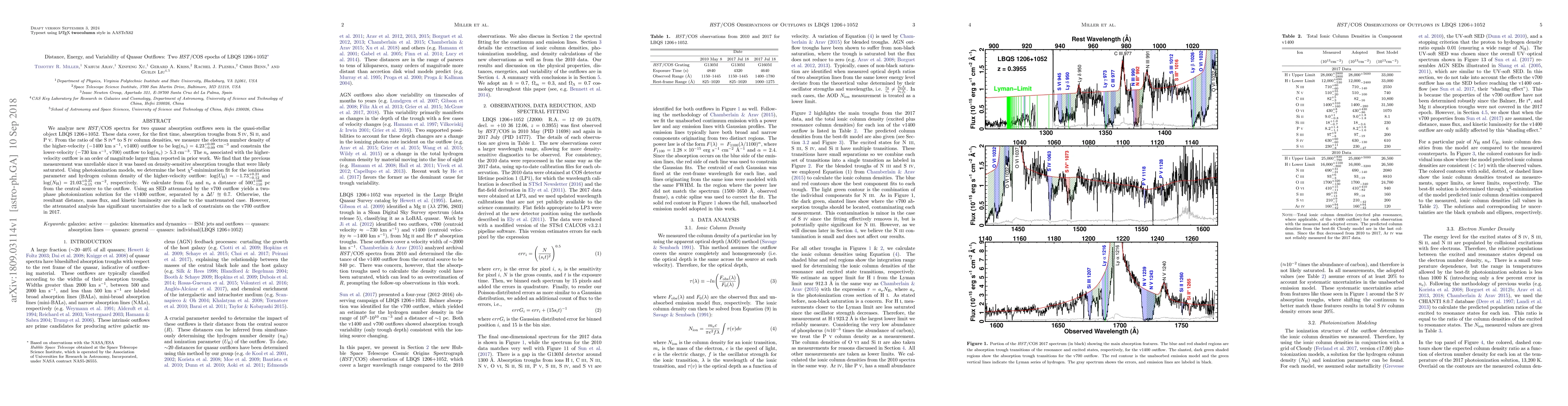 This study analyzes new HST/COS spectra of quasar outflows in LBQS 1206+1052, revealing higher electron densities and distances for the higher-velocity outflow compared to previous measurements. The distance to the outflow is estimated at 500 pc, with significant uncertainties due to lack of constraints on lower-velocity outflow.