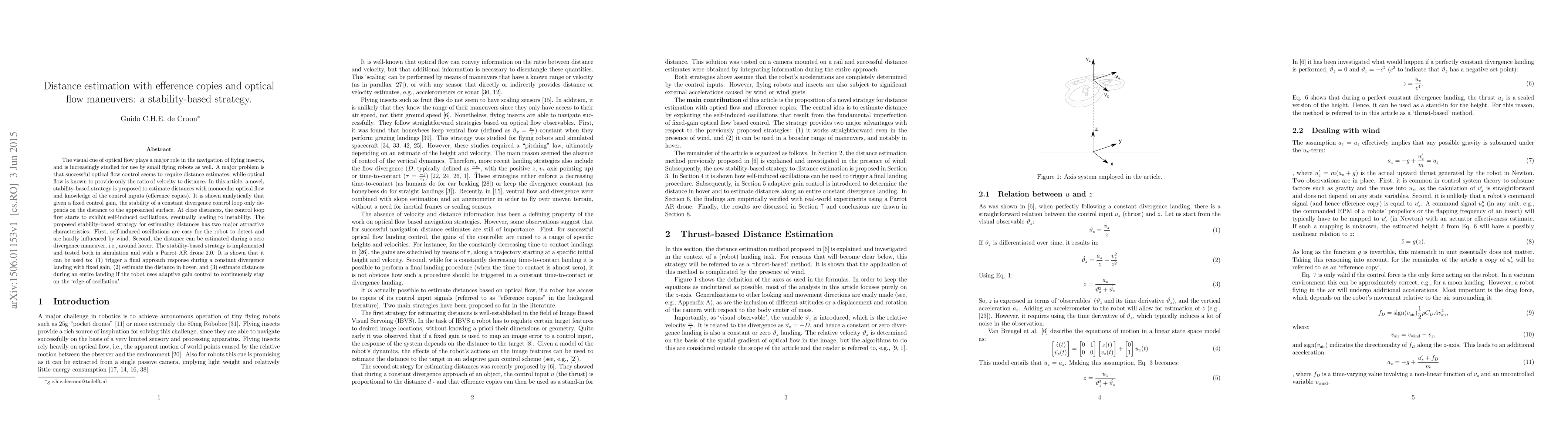 The visual cue of optical flow plays a major role in the navigation of flying insects, and is increasingly studied for use by small flying robots as well. A major problem is that successful optical flow control seems to require distance estimates, while optical flow is known to provide only the ratio of velocity to distance. In this article, a novel, stability-based strategy is proposed to estimate distances with monocular optical flow and knowledge of the control inputs (efference copies). It is shown analytically that given a fixed control gain, the stability of a constant divergence control loop only depends on the distance to the approached surface. At close distances, the control loop first starts to exhibit self-induced oscillations, eventually leading to instability. The proposed stability-based strategy for estimating distances has two major attractive characteristics. First, self-induced oscillations are easy for the robot to detect and are hardly influenced by wind. Second, the distance can be estimated during a zero divergence maneuver, i.e., around hover. The stability-based strategy is implemented and tested both in simulation and with a Parrot AR drone 2.0. It is shown that it can be used to: (1) trigger a final approach response during a constant divergence landing with fixed gain, (2) estimate the distance in hover, and (3) estimate distances during an entire landing if the robot uses adaptive gain control to continuously stay on the 'edge of oscillation'.