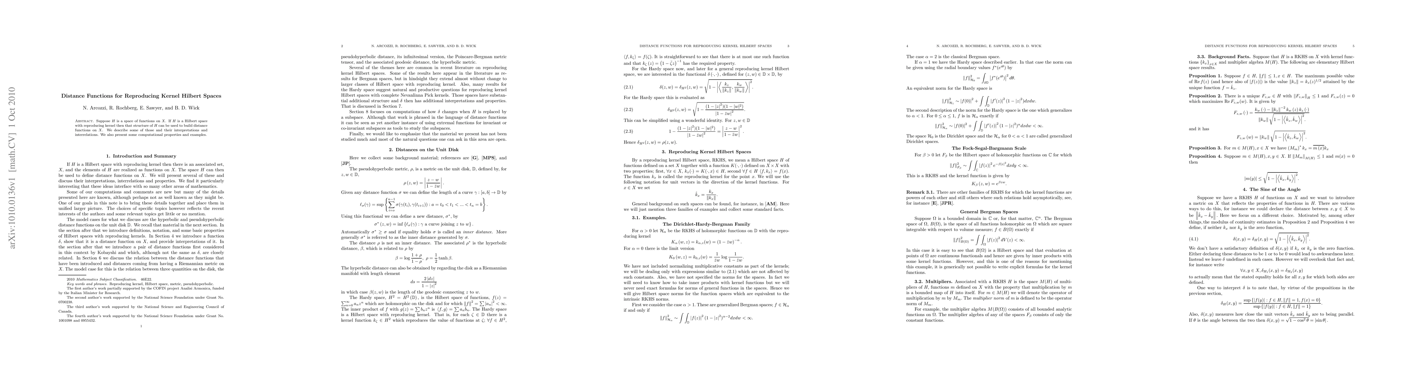 Suppose H is a space of functions on X. If H is a Hilbert space with reproducing kernel then that structure of H can be used to build distance functions on X. We describe some of those and their interpretations and interrelations. We also present some computational properties and examples.