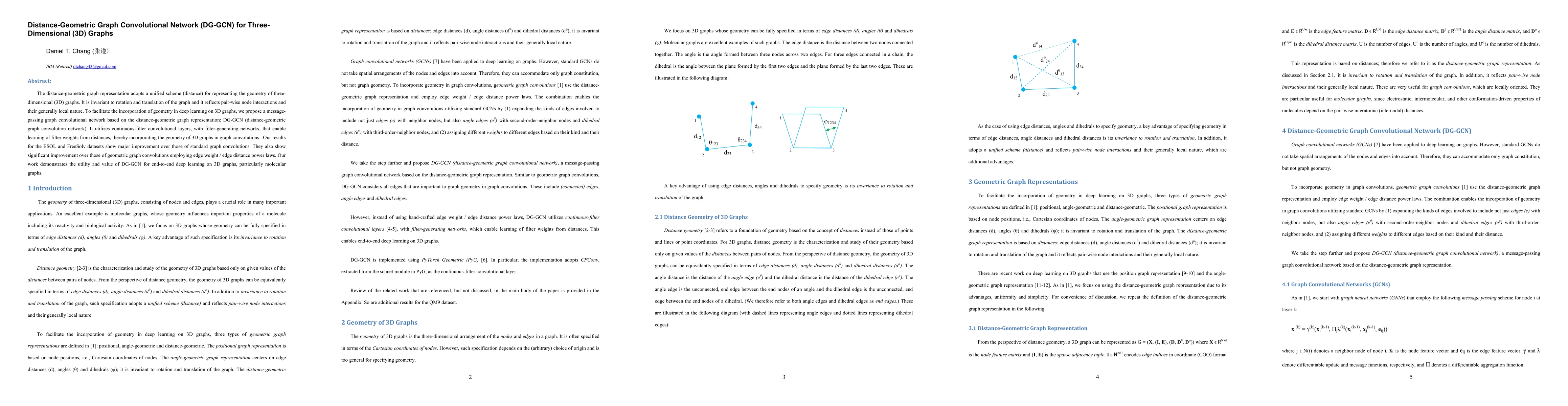 The DG-GCN leverages a distance-geometric graph representation to incorporate 3D geometry into graph convolutional networks, achieving superior performance on molecular graph datasets compared to standard and geometric graph convolutions. This approach demonstrates the effectiveness of geometric information in deep learning for 3D graph applications.