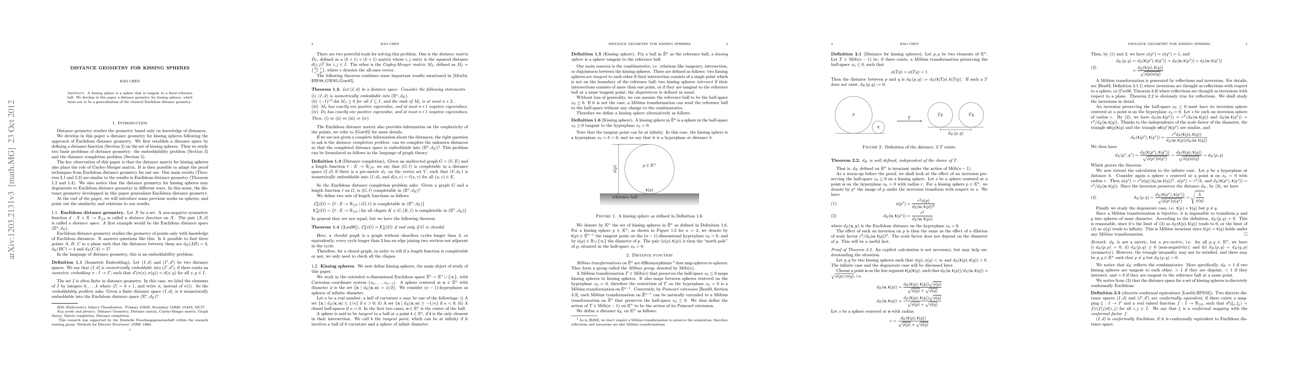 A kissing sphere is a sphere that is tangent to a fixed reference ball. We develop in this paper a distance geometry for kissing spheres, which turns out to be a generalization of the classical Euclidean distance geometry.