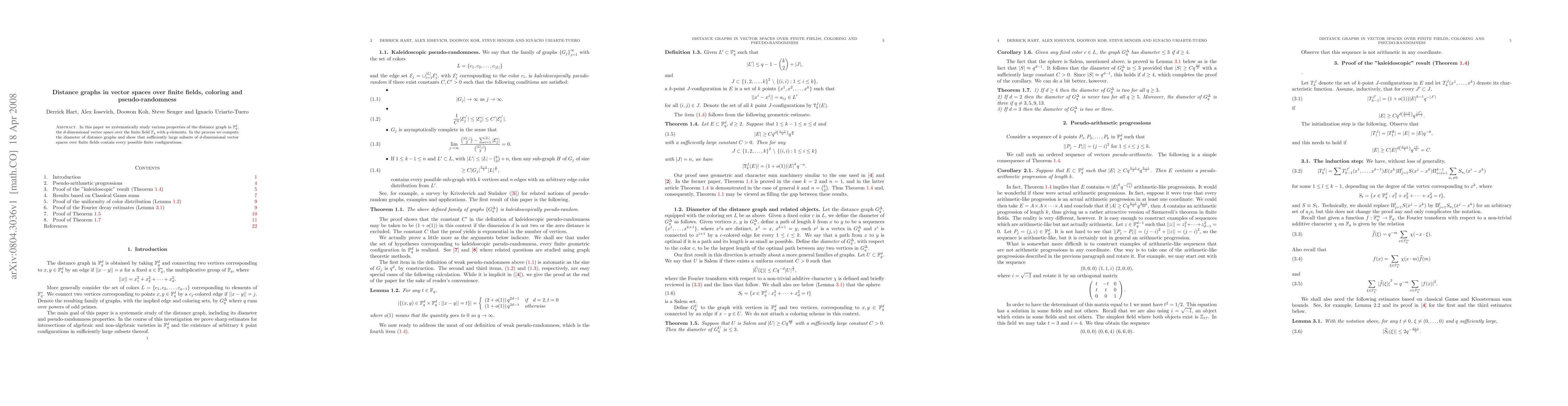 This paper investigates the properties of distance graphs in $d$-dimensional vector spaces over finite fields ${\Bbb F}_q$, computing their diameter and demonstrating that large subsets contain every possible finite configuration. It also explores the implications for coloring and pseudo-randomness.