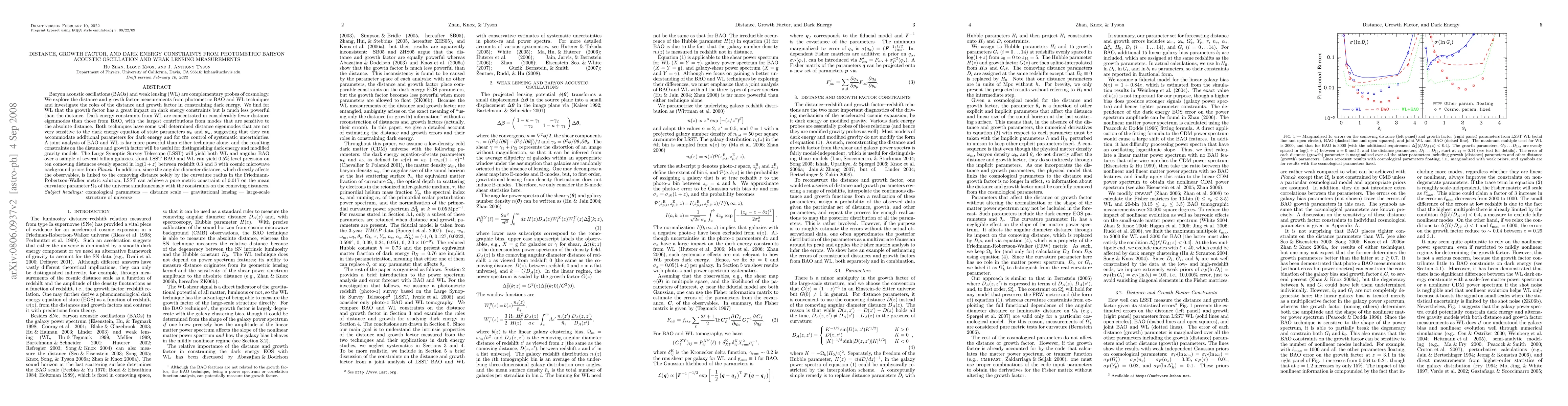 Baryon acoustic oscillations (BAOs) and weak lensing (WL) are complementary probes of cosmology. We explore the distance and growth factor measurements from photometric BAO and WL techniques and investigate the roles of the distance and growth factor in constraining dark energy. We find for WL that the growth factor has a great impact on dark energy constraints but is much less powerful than the distance. Dark energy constraints from WL are concentrated in considerably fewer distance eigenmodes than those from BAO, with the largest contributions from modes that are sensitive to the absolute distance. Both techniques have some well determined distance eigenmodes that are not very sensitive to the dark energy equation of state parameters w_0 and w_a, suggesting that they can accommodate additional parameters for dark energy and for the control of systematic uncertainties. A joint analysis of BAO and WL is far more powerful than either technique alone, and the resulting constraints on the distance and growth factor will be useful for distinguishing dark energy and modified gravity models. The Large Synoptic Survey Telescope (LSST) will yield both WL and angular BAO over a sample of several billion galaxies. Joint LSST BAO and WL can yield 0.5% level precision on ten comoving distances evenly spaced in log(1+z) between redshift 0.3 and 3 with cosmic microwave background priors from Planck. In addition, since the angular diameter distance, which directly affects the observables, is linked to the comoving distance solely by the curvature radius in the Friedmann-Robertson-Walker metric solution, LSST can achieve a pure metric constraint of 0.017 on the mean curvature parameter Omega_k of the universe simultaneously with the constraints on the comoving distances.