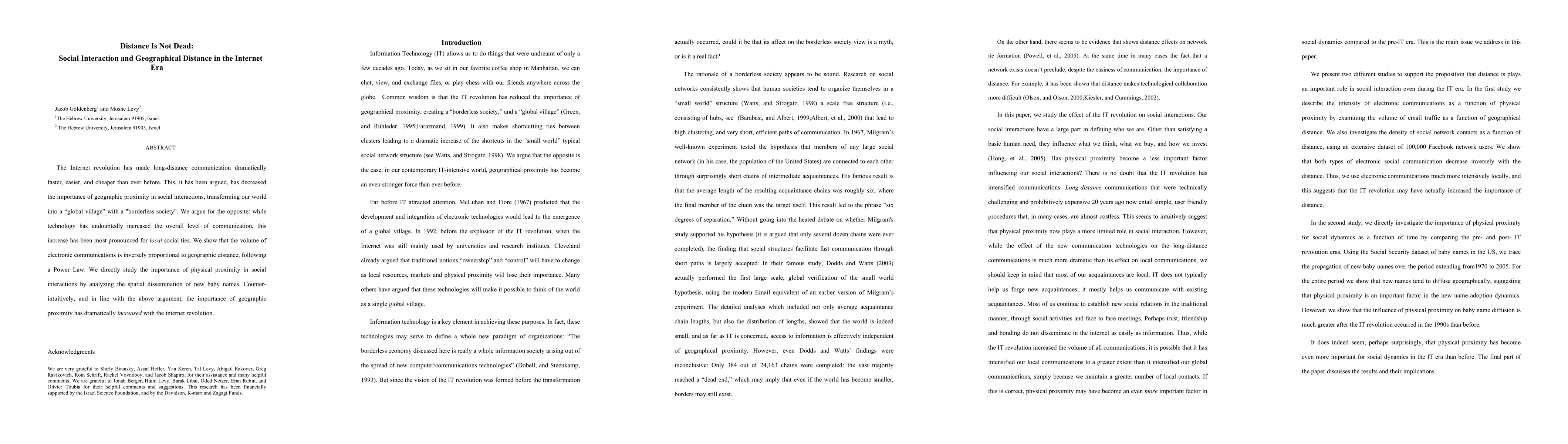 The Internet revolution has made long-distance communication dramatically faster, easier, and cheaper than ever before. This, it has been argued, has decreased the importance of geographic proximity in social interactions, transforming our world into a global village with a borderless society. We argue for the opposite: while technology has undoubtedly increased the overall level of communication, this increase has been most pronounced for local social ties. We show that the volume of electronic communications is inversely proportional to geographic distance, following a Power Law. We directly study the importance of physical proximity in social interactions by analyzing the spatial dissemination of new baby names. Counter-intuitively, and in line with the above argument, the importance of geographic proximity has dramatically increased with the internet revolution.