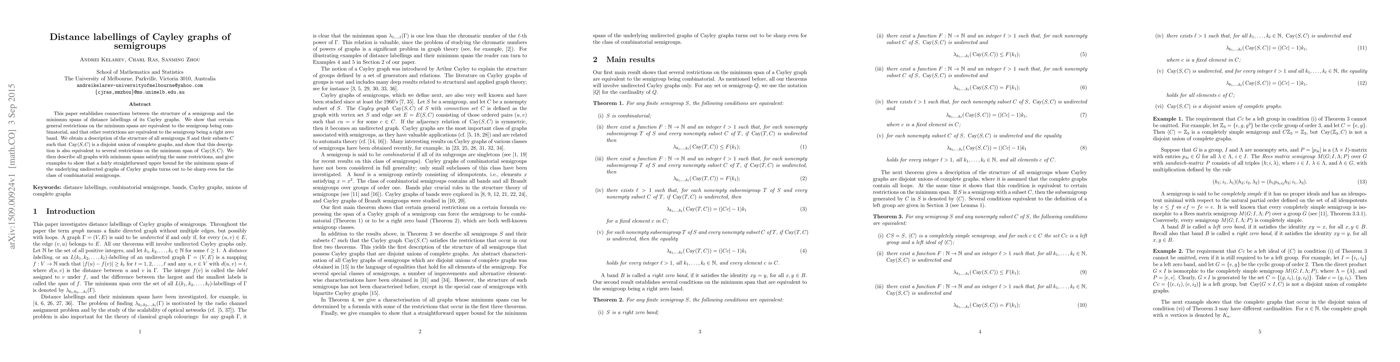 This paper establishes connections between semigroup structure and distance labelling of Cayley graphs, showing that certain restrictions are equivalent to combinatorial or right zero band semigroups.