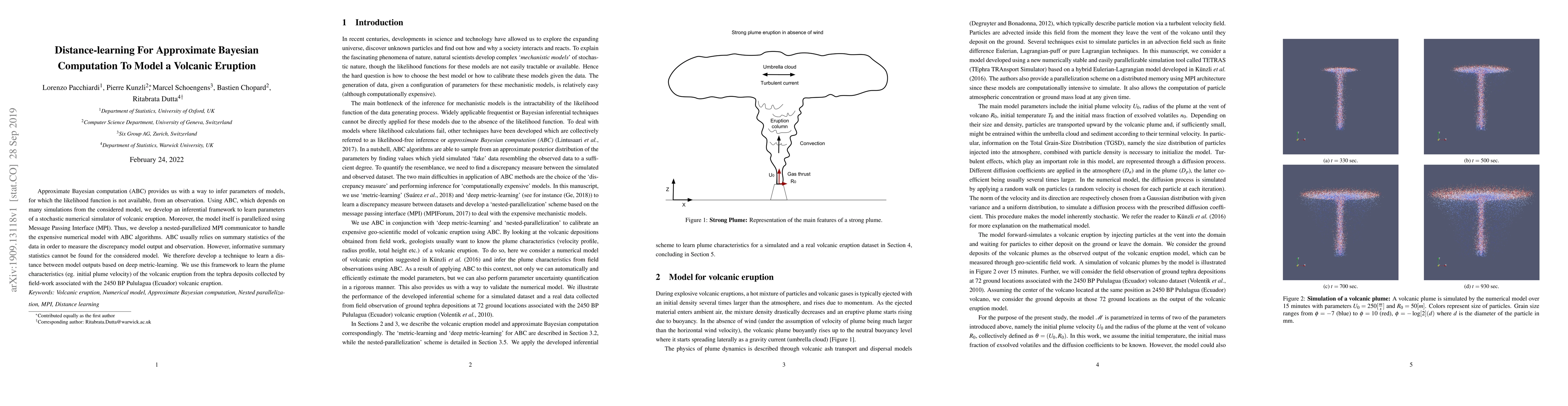 Approximate Bayesian computation (ABC) provides us with a way to infer parameters of models, for which the likelihood function is not available, from an observation. Using ABC, which depends on many simulations from the considered model, we develop an inferential framework to learn parameters of a stochastic numerical simulator of volcanic eruption. Moreover, the model itself is parallelized using Message Passing Interface (MPI). Thus, we develop a nested-parallelized MPI communicator to handle the expensive numerical model with ABC algorithms. ABC usually relies on summary statistics of the data in order to measure the discrepancy model output and observation. However, informative summary statistics cannot be found for the considered model. We therefore develop a technique to learn a distance between model outputs based on deep metric-learning. We use this framework to learn the plume characteristics (eg. initial plume velocity) of the volcanic eruption from the tephra deposits collected by field-work associated with the 2450 BP Pululagua (Ecuador) volcanic eruption.