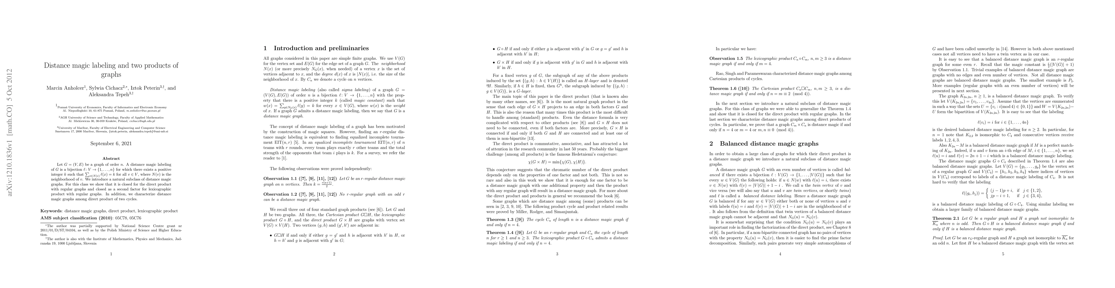 Let $G=(V,E)$ be a graph of order $n$. A distance magic labeling of $G$ is a bijection $\ell \colon V\rightarrow {1,...,n}$ for which there exists a positive integer $k$ such that $\sum_{x\in N(v)}\ell (x)=k$ for all $v\in V $, where $N(v)$ is the neighborhood of $v$. We introduce a natural subclass of distance magic graphs. For this class we show that it is closed for the direct product with regular graphs and closed as a second factor for lexicographic product with regular graphs. In addition, we characterize distance magic graphs among direct product of two cycles.