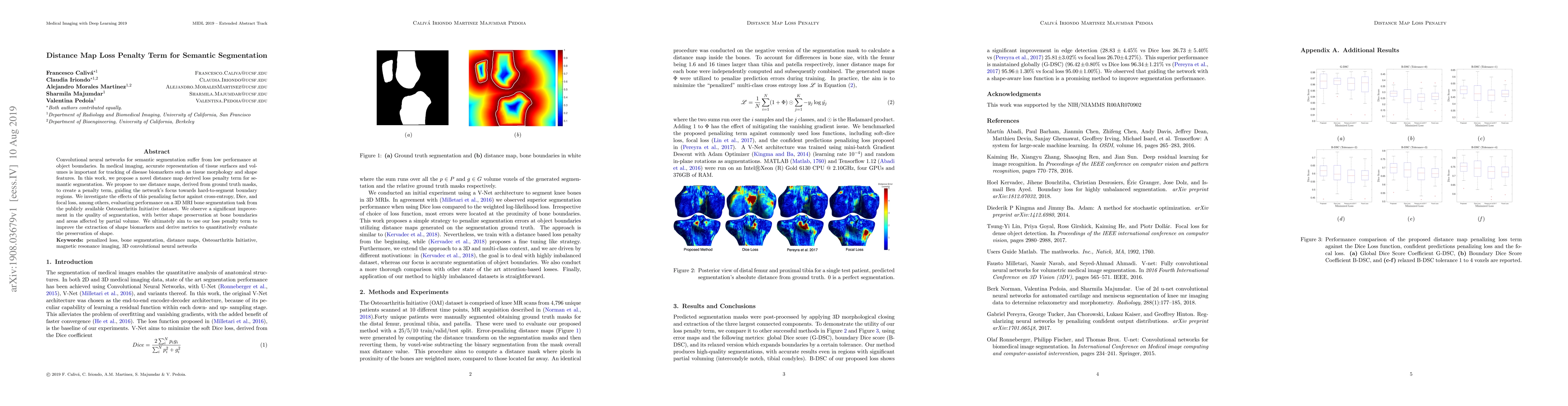 This paper proposes a novel distance map loss penalty term to enhance semantic segmentation performance, particularly at object boundaries, crucial for medical imaging. The method significantly improves segmentation quality in 3D MRI bone segmentation, leading to better shape preservation and partial volume areas, as demonstrated on the Osteoarthritis Initiative dataset.