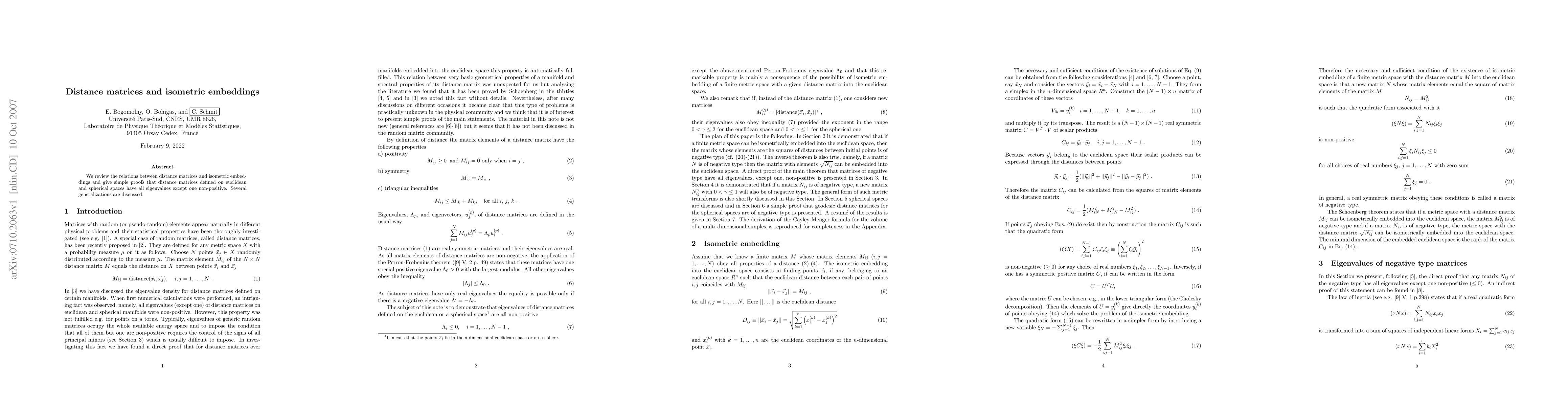 Summary: This paper explores the connections between distance matrices and isometric embeddings, proving that distance matrices derived from Euclidean and spherical spaces have all but one eigenvalue as non-negative. It also discusses various generalizations of these concepts.