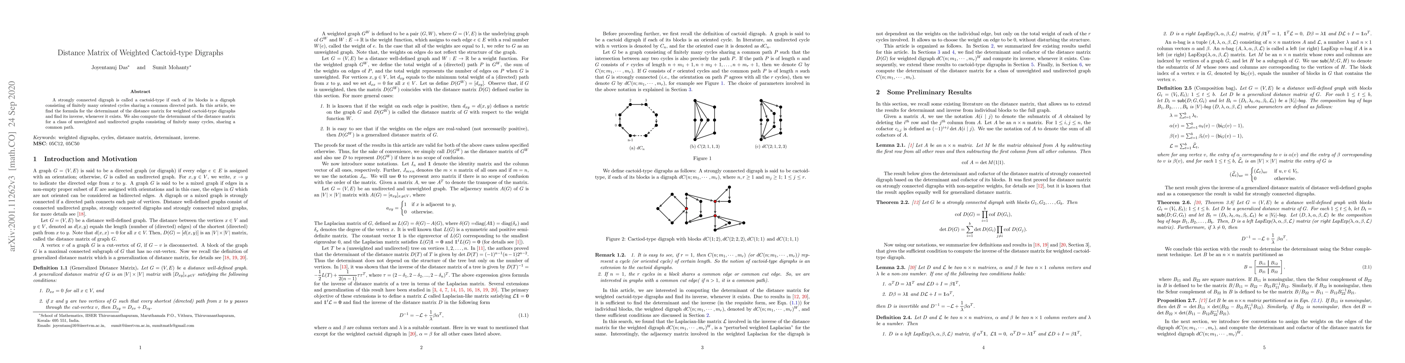 This research derives a formula for the determinant and its inverse of the distance matrix for weighted cactoid-type digraphs, where each block is a digraph made of finitely many oriented cycles sharing a common path. It also calculates the determinant of the distance matrix for unweighted, undirected graphs composed of finitely many cycles along a common path.