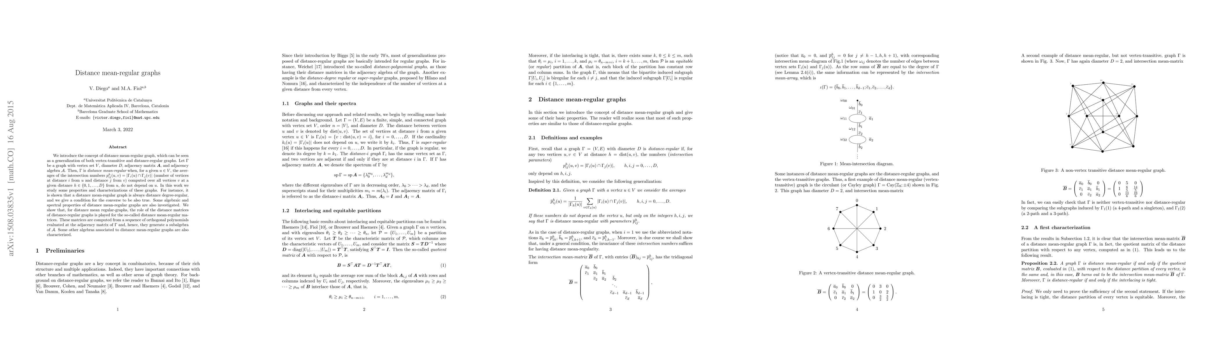 We introduce the concept of distance mean-regular graph, which can be seen as a generalization of both vertex-transitive and distance-regular graphs. Let $\Gamma$ be a graph with vertex set $V$, diameter $D$, adjacency matrix $A$, and adjacency algebra ${\cal A}$. Then, $\Gamma$ is $distance$ $mean$-$regular$ when, for a given $u\in V$, the averages of the intersection numbers $p_{ij}^h(u,v)=|\Gamma_i(u)\cap \Gamma_j(v)|$ (number of vertices at distance $i$ from $u$ and distance $j$ from $v$) computed over all vertices $v$ at a given distance $h\in \{0,1,\ldots,D\}$ from $u$, do not depend on $u$. In this work we study some properties and characterizations of these graphs. For instance, it is shown that a distance mean-regular graph is always distance degree-regular, and we give a condition for the converse to be also true. Some algebraic and spectral properties of distance mean-regular graphs are also investigated. We show that, for distance mean regular-graphs, the role of the distance matrices of distance-regular graphs is played for the so-called distance mean-regular matrices. These matrices are computed from a sequence of orthogonal polynomials evaluated at the adjacency matrix of $\Gamma$ and, hence, they generate a subalgebra of ${\cal A}$. Some other algebras associated to distance mean-regular graphs are also characterized.