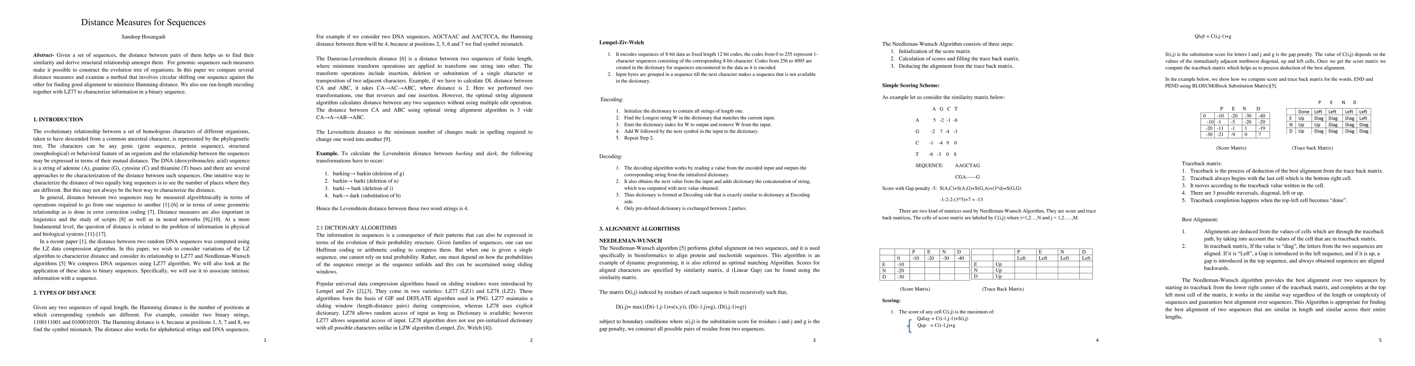 This paper compares distance measures for sequences to find similarities and construct evolution trees of organisms. It also proposes a method using circular shifting and run-length encoding to minimize Hamming distance and characterize information in binary sequences.