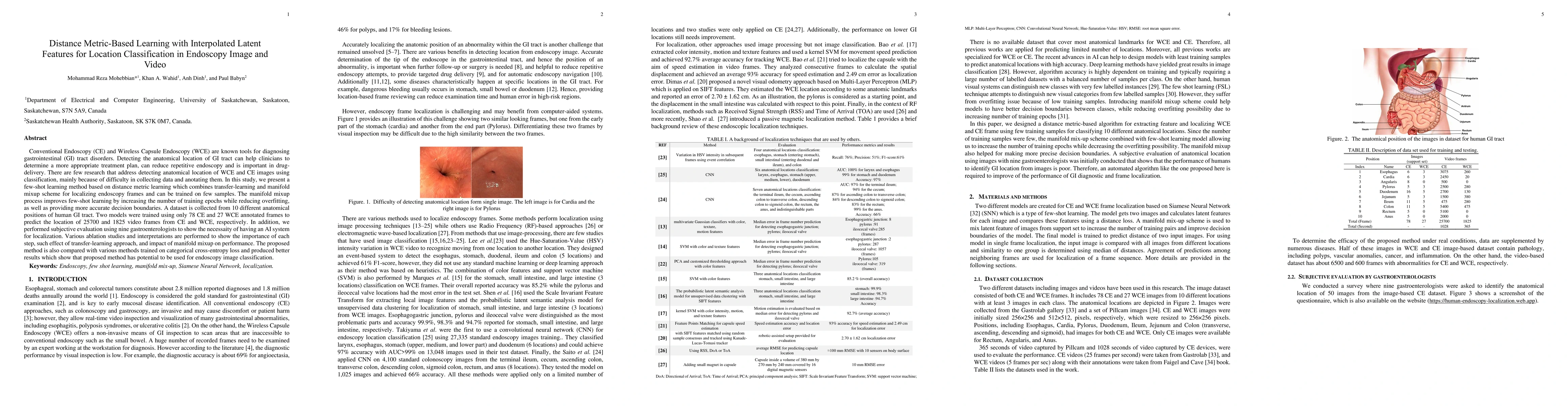 This paper proposes a few-shot learning method for classifying endoscopy images using distance metric learning and a manifold mixup scheme to localize anatomical locations in the gastrointestinal tract. The method, trained on limited annotated samples, demonstrates improved performance over traditional methods and shows potential for reducing repetitive endoscopies and aiding in treatment planning.