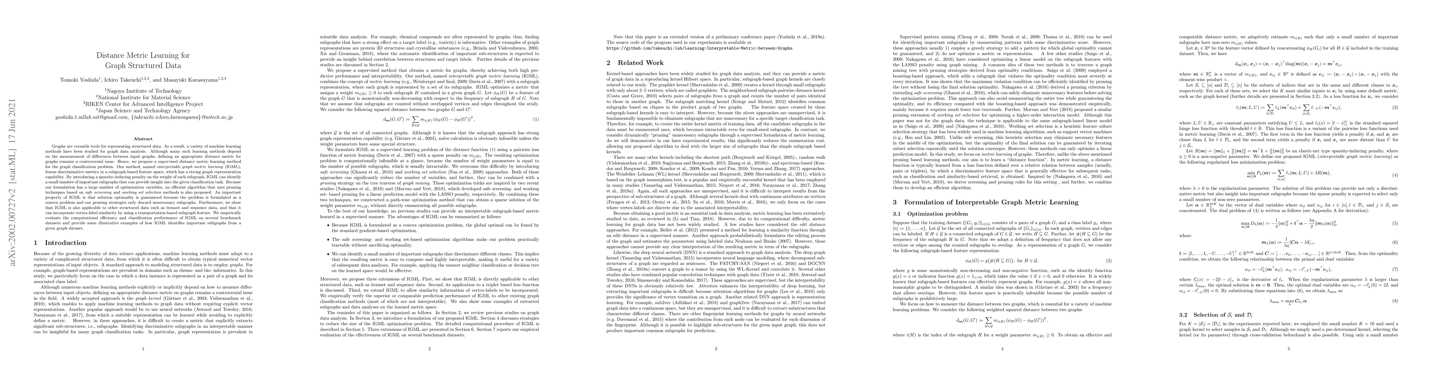This paper proposes interpretable graph metric learning (IGML), a supervised method for learning discriminative distance metrics in a subgraph-based feature space for graph classification. IGML leverages a sparsity-inducing penalty to identify important subgraphs and uses efficient algorithms to handle optimization complexity, ensuring solution optimality through a convex formulation.