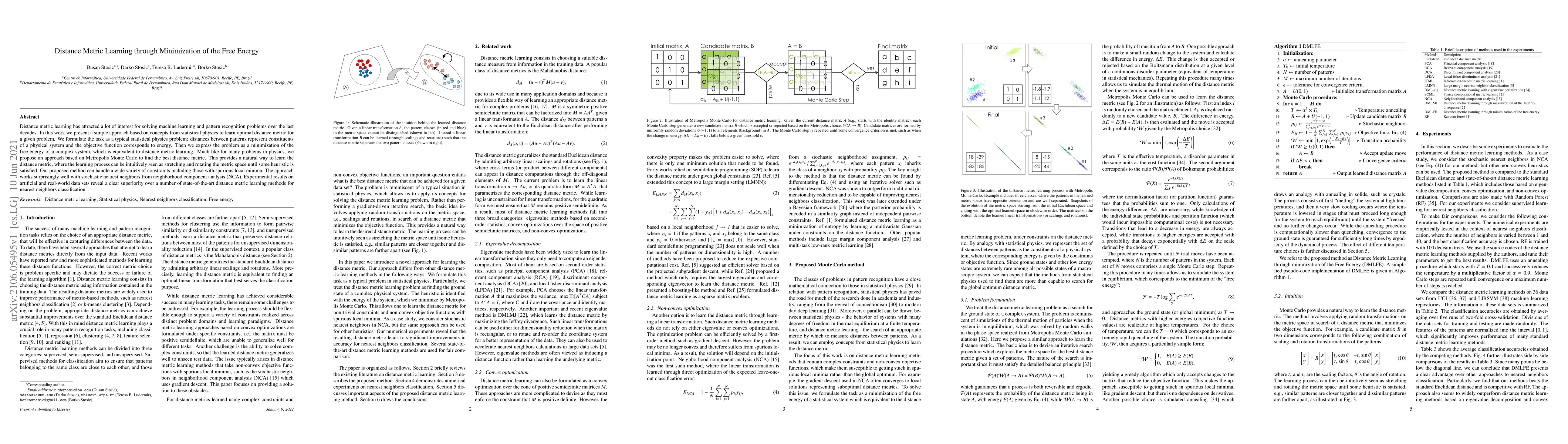 A new method uses statistical physics to learn optimal distance metrics for machine learning tasks, outperforming state-of-the-art methods on nearest neighbors classification.