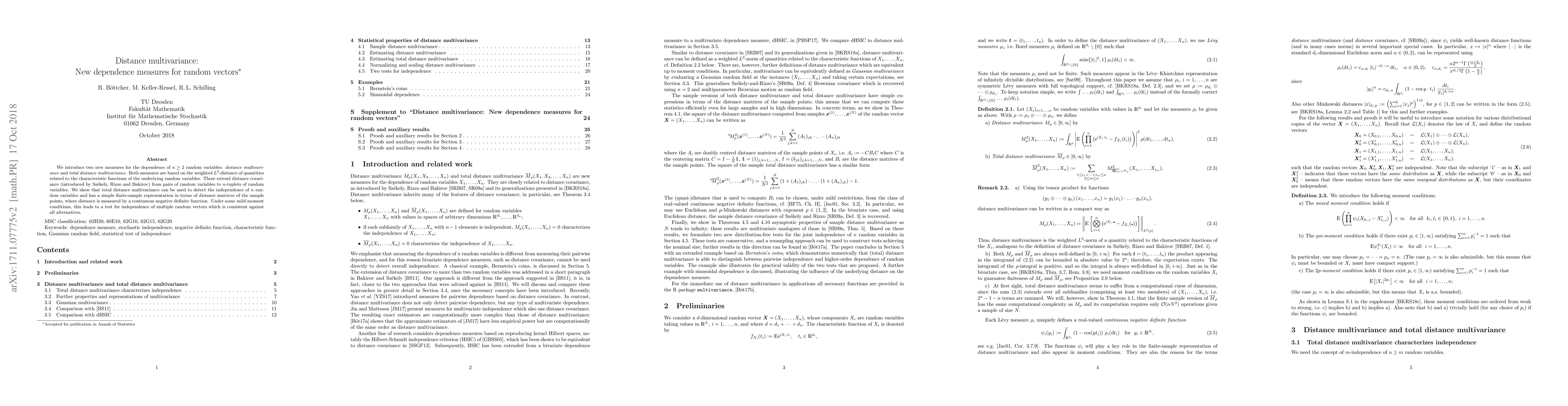 This paper introduces two new dependence measures—distance multivariance and total distance multivariance—for $n \ge 2$ random variables, extending distance covariance to $n$-tuplets. It demonstrates that total distance multivariance can detect independence and provides a finite-sample representation for testing independence of multiple random vectors.