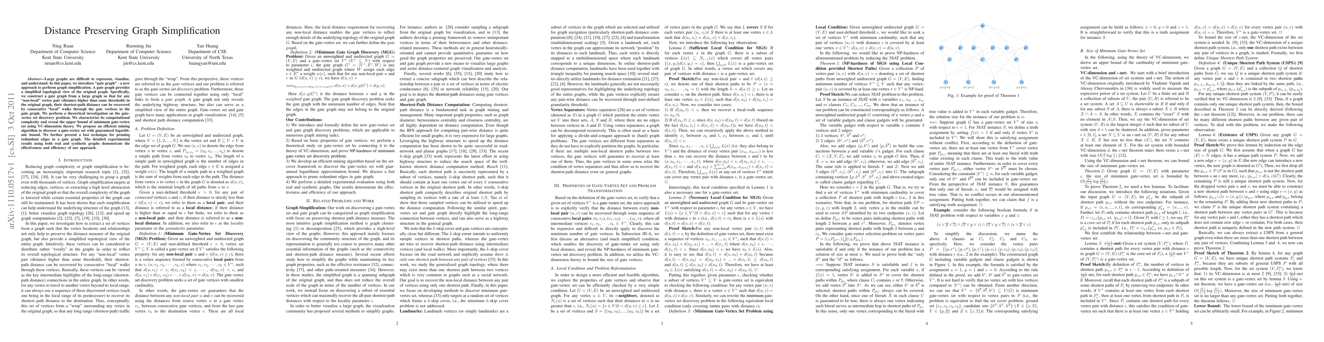 Large graphs are difficult to represent, visualize, and understand. In this paper, we introduce "gate graph" - a new approach to perform graph simplification. A gate graph provides a simplified topological view of the original graph. Specifically, we construct a gate graph from a large graph so that for any "non-local" vertex pair (distance higher than some threshold) in the original graph, their shortest-path distance can be recovered by consecutive "local" walks through the gate vertices in the gate graph. We perform a theoretical investigation on the gate-vertex set discovery problem. We characterize its computational complexity and reveal the upper bound of minimum gate-vertex set using VC-dimension theory. We propose an efficient mining algorithm to discover a gate-vertex set with guaranteed logarithmic bound. We further present a fast technique for pruning redundant edges in a gate graph. The detailed experimental results using both real and synthetic graphs demonstrate the effectiveness and efficiency of our approach.