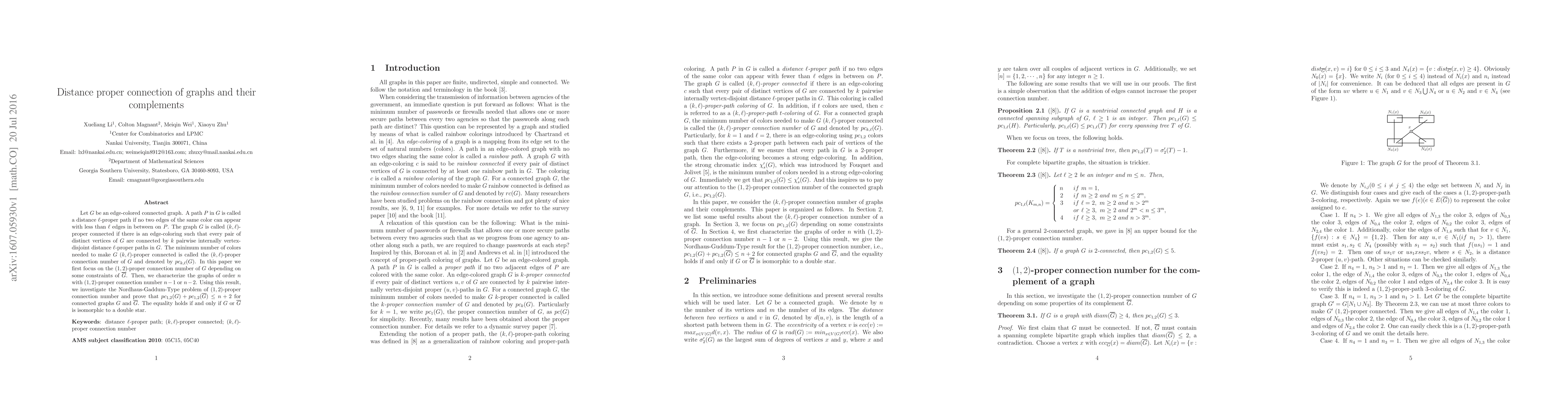 Let $G$ be an edge-colored connected graph. A path $P$ in $G$ is called a distance $\ell$-proper path if no two edges of the same color can appear with less than $\ell$ edges in between on $P$. The graph $G$ is called $(k,\ell)$-proper connected if there is an edge-coloring such that every pair of distinct vertices of $G$ are connected by $k$ pairwise internally vertex-disjoint distance $\ell$-proper paths in $G$. The minimum number of colors needed to make $G$ $(k,\ell)$-proper connected is called the $(k,\ell)$-proper connection number of $G$ and denoted by $pc_{k,\ell}(G)$. In this paper we first focus on the $(1,2)$-proper connection number of $G$ depending on some constraints of $\overline G$. Then, we characterize the graphs of order $n$ with $(1,2)$-proper connection number $n-1$ or $n-2$. Using this result, we investigate the Nordhaus-Gaddum-Type problem of $(1,2)$-proper connection number and prove that $pc_{1,2}(G)+pc_{1,2}(\overline{G})\leq n+2$ for connected graphs $G$ and $\overline{G}$. The equality holds if and only if $G$ or $\overline{G}$ is isomorphic to a double star.