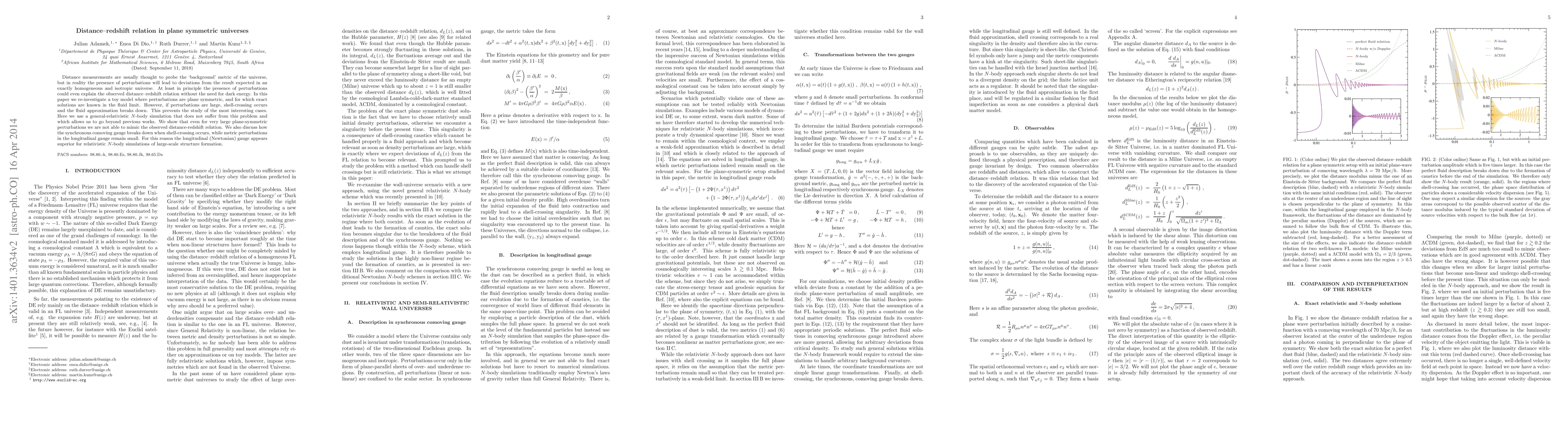 This paper uses general-relativistic N-body simulations to study plane-symmetric cosmic perturbations, aiming to explain the distance-redshift relation without dark energy. Despite large perturbations, the observed relation cannot be replicated, and the longitudinal (Newtonian) gauge is deemed superior for such simulations due to avoiding gauge breakdown issues.